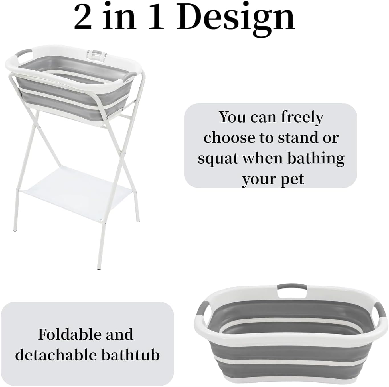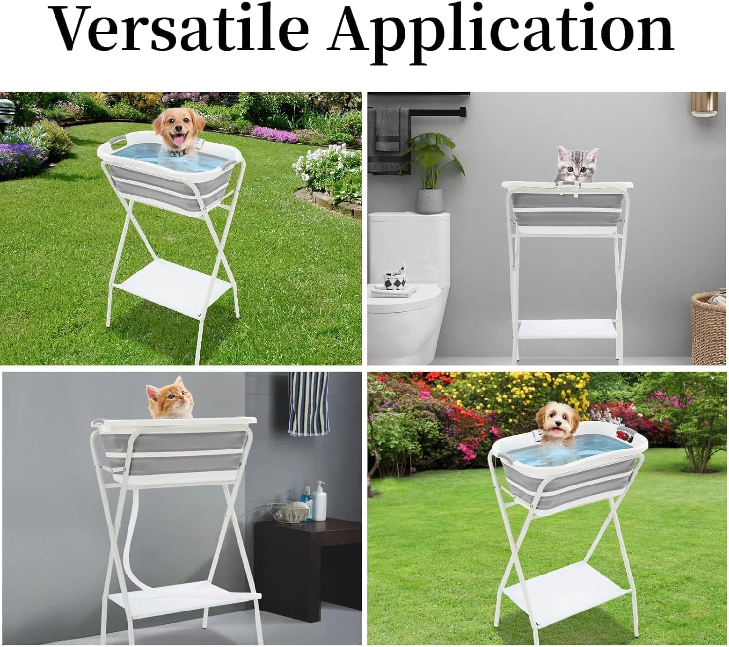 DescriptionDesigned with both functionality and comfort in mind, this pet bathtub is a fabulous solution for keeping your furry friend clean and happy. Featuring a spacious and sturdy basin, it provides ample room for your pet while you easily rinse away dirt and shampoo. The thoughtful addition of a support stand ensures optimal height for easy access and stress-free bathing sessions. Whether you're caring for a cute cat or a small dog, this pet bath seamlessly combines convenience and style, making it an essential accessory for every pet-loving household.DetailsSecurely Fastened Safety Belt: It securely fastens pets inside the bathtub, ensuring they are both safe and comfortable during bath time, making pet care a more elegant and relaxed experience.Safe Rounded Corners: This product features smooth edges and round corners that not only give it excellent aesthetic appeal but also demonstrate our attention to user care.Storage Rack: The bottom storage rack can be used to store shower products, towels, etc.(not included) for added convenience.ApplicationIt applies to small dogs and cats. It is very suitable for both outdoor and indoor use.Specification Material: Iron, PP, TPEProcess: Welding, Injection MoldingColor: White, GreyStyle: ModernAssembly Required: YesMount Type: FreestandingTotal Load-bearing Capacity: 50kg/110.23lbs Overall Product Height: 98.5cm/38.8inBathtub Size: 66*42*25cm/26*16.5*9.8inPackage Size: 66.5*52*12cm/26.18*20.47*4.72inGross Weight: 5.65kg/12.46lbsNet Weight: 5.37kg/11.84lbsPackage Included1* Pet Bathtub 1* Stand 1* Drainage Pipe1* English ManualOther Accessories for AssemblyNotes1. Please carefully check the product size before purchasing.2. For your safety, please ensure that you place the product in a stable position and use it within the product's load-bearing capacity.3. Please allow the slight color difference caused by the shooting light and 1-3cm error due to manual measurement, and make sure you do not mind before ordering.