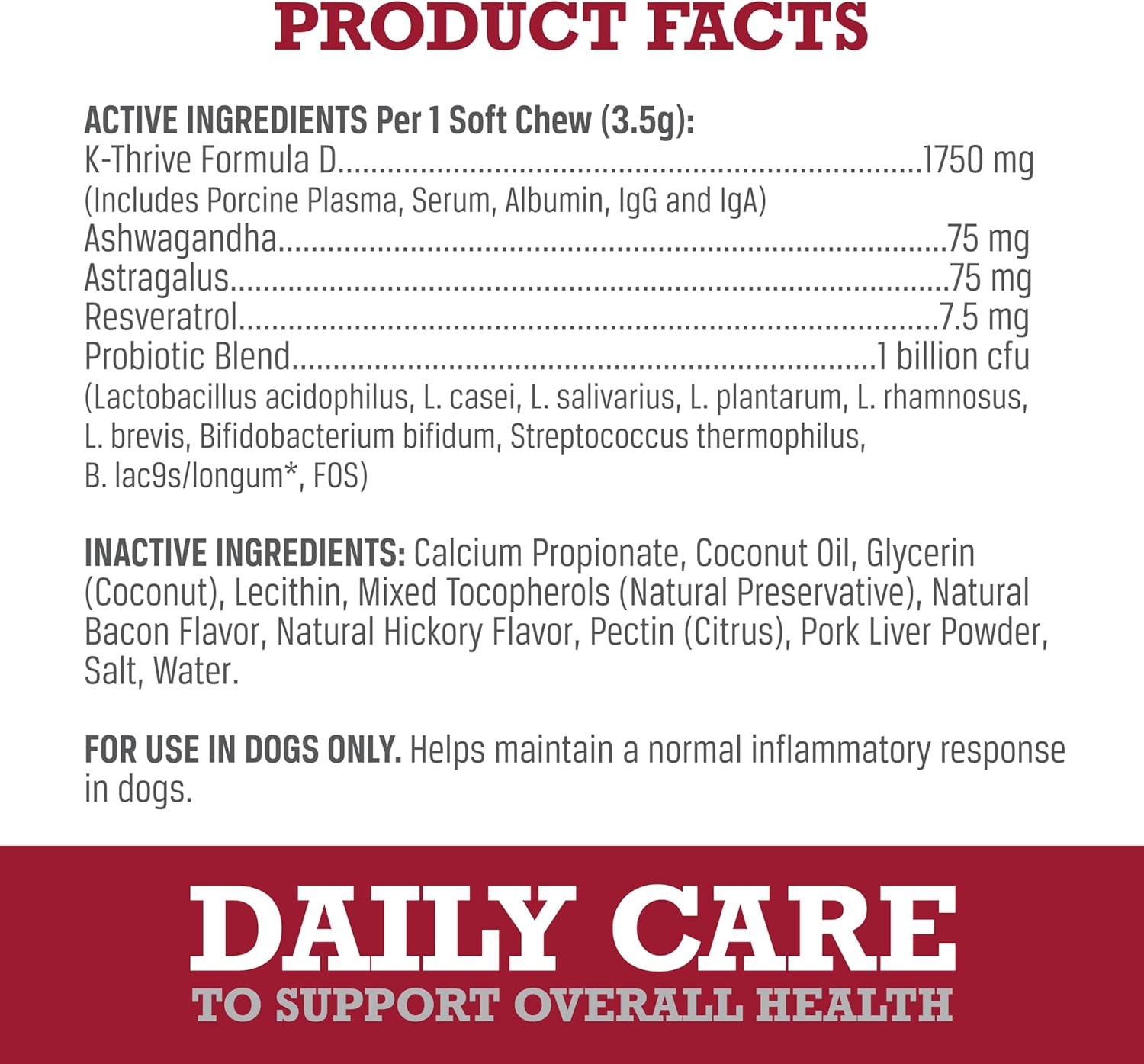 | Active Ingredients | ACTIVE INGREDIENTS Per 1 Chew (3.5g): K-Thrive™ Formula D..................................................................................1750 mg (Includes Porcine Plasma, Serum, Albumin, IgG and IgA) Ashwagandha.................................................................................................75 mg Astragalus.........................................................................................................75 mg Resveratrol........................................................................................................7.5 mg Probiotic Blend.....................................................................................1 billion cfu (Lactobacillus acidophilus, L. casei, L. salivarius, L. plantarum, L. rhamnosus, L. brevis, Bifidobacterium bifidum, Streptococcus thermophilus, B. lac9s/longum*, FOS) |