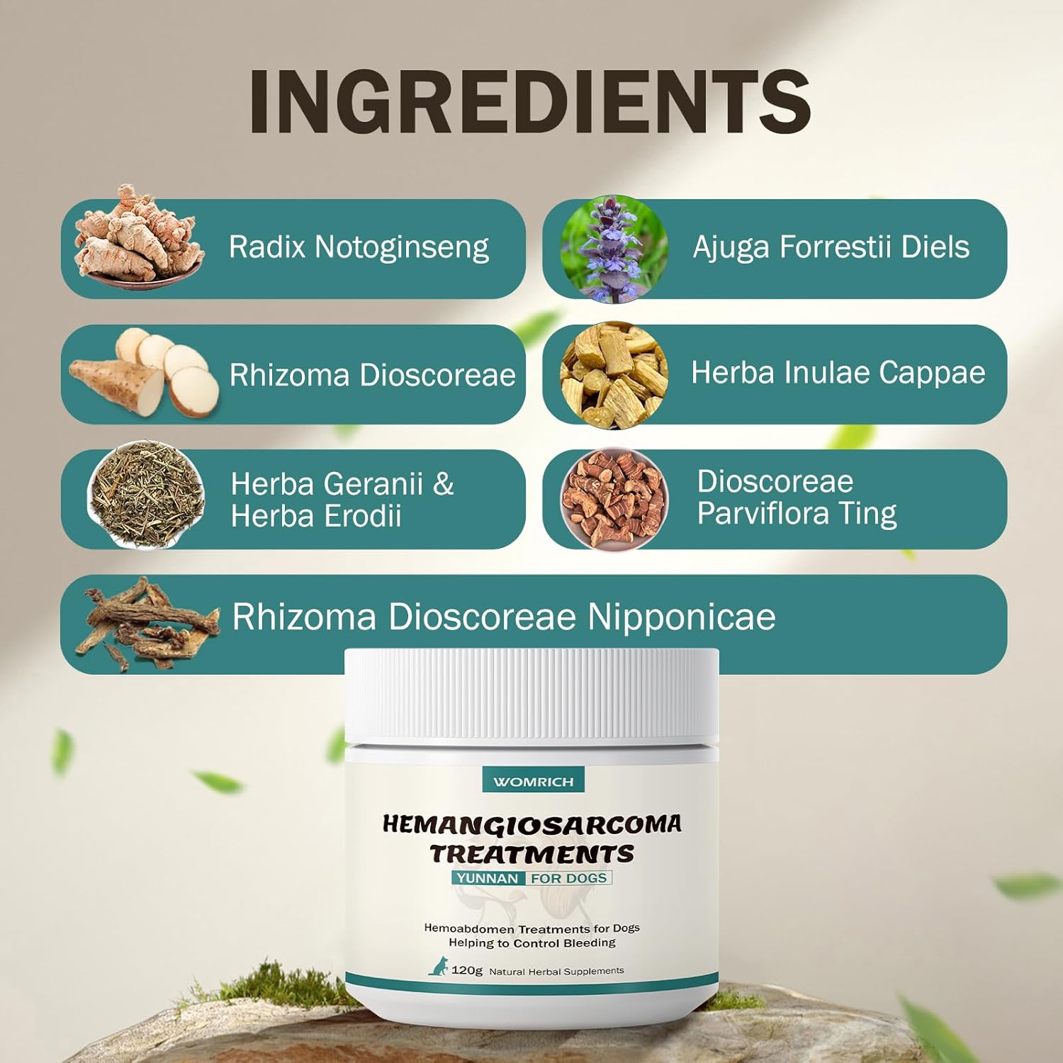 This Blood Support for Dog supplement powder offers comprehensive support for dogs dealing with bleeding issues like hemangiosarcoma and hemoabdomen. It soothes digestive discomfort, boosts energy, and speeds up recovery after surgery or injuries. With a gentle formula that blends seamlessly into meals, this supplement is a simple, effective way to support your dog's health.When Your Dog’s Bleeding Feels Hopeless...We get it – watching your pup struggle with bloody vomit or sudden nosebleeds is terrifying. That’s why we created this 100% plant-powered formula with proven herbs.The Science Behind the Herbs→ Radix Notoginseng: Quick Stops bleeding→ Rhizoma Dioscoreae: Soothes gut lining damaged by ulcers→ Ajuga Forrestii Diels: Strengthens weak blood vessels in cancer-prone dogsHow to UseEmergency bleeding: Double dose for 3 daysChronic conditions:under 25 lbs - 1/4 tsp daily26-50 lbs - 1/2 tsp daily51-75 lbs - 3/4 tsp dailyover 75 lbs - 1 tsp dailyPost-surgery: Continue for 2 weeks after stitches are removed.