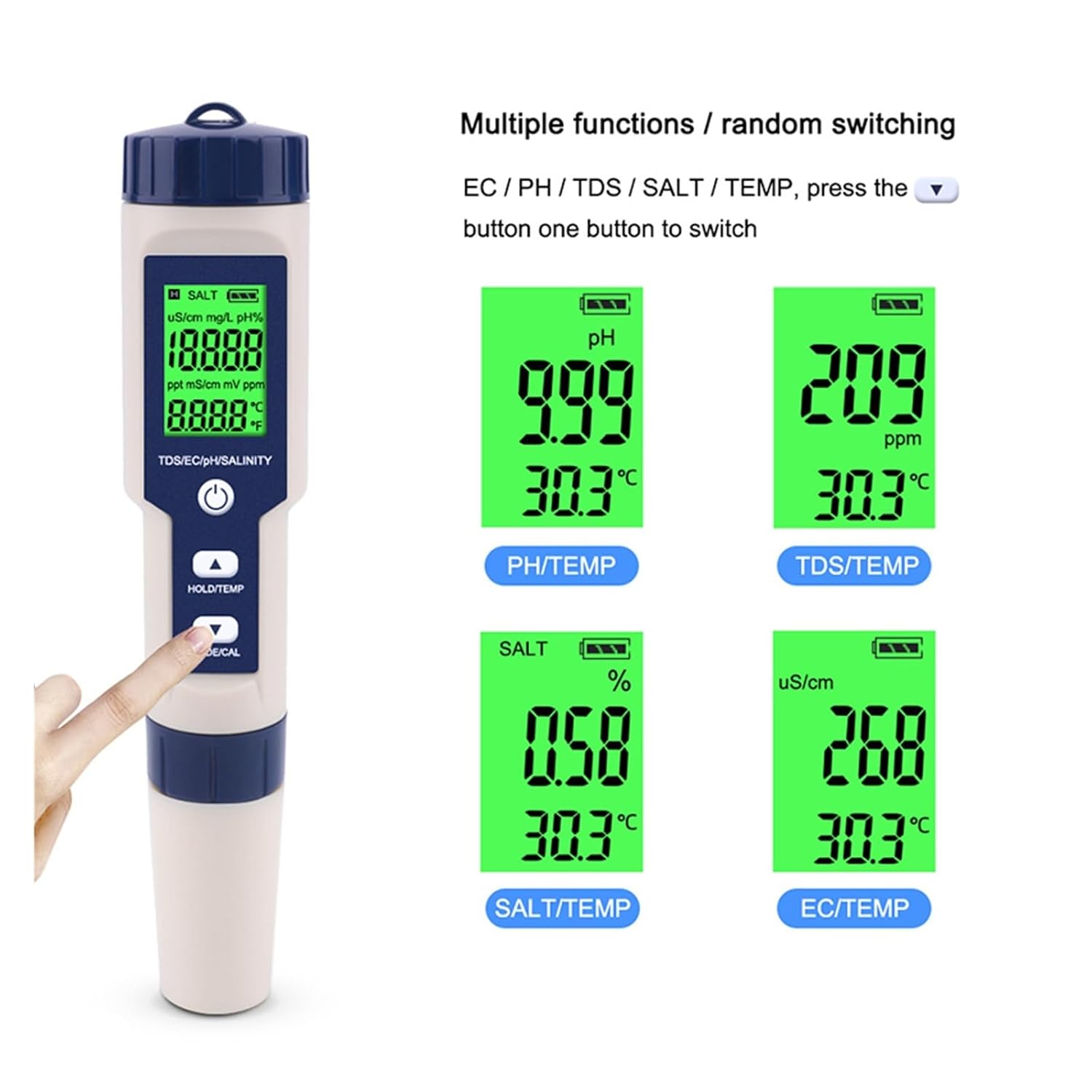 Product parametersConductivity test range: 0 to 10000uS/cm 10.01-19.99ms 20.1-400mS/CMResolution: 1uS/cm; 0.1mS/CMAccuracy: ± 2% of readingTds testing range: 0 to 1000ppm, 1000ppm to 10000ppm, 10.1 to 200.0pptResolution: 1ppm;; 0.1pptAccuracy: ± 2% of readinSalinity measurement range: 0.00 to 25.00%Resolution: 0.01%Accuracy: 0.01-5.00% (± 0.1%) 5.10-25.00% (± 1%)PH testing range: 0.01-14.00pHResolution: 0.01pH Precision: ± 0.05pHTemperature compensation: Automatic temperature compensation (ATC)Working environment: 0 to 60.0 (32.0 to 140 ); RH 100%TDS factor: 0.4 to 1.0Temperature range: 0.1-60.0 32.0-140 Temperature accuracy: ± 0.5 Temperature resolution: 0.1 /Automatic shutdown: approximately 5 minutes 3x1.5LR44Bare metal size and weight: 183 * 37 * 37mm (7.2 * 1.5 * 1.5in)/90g (3.2oz)Packaging size: 236 * 80 * 50mm 170gDisplay: Backlight supportWaterproof grade: IP67Power consumption: 2.9 mA, shutdown power consumption is 0The accuracy is relatively accurate within 150ppt, and there is a significant deviation above 160ppt,Attention: Every time you use it, be sure to clean the electrodes thoroughly
