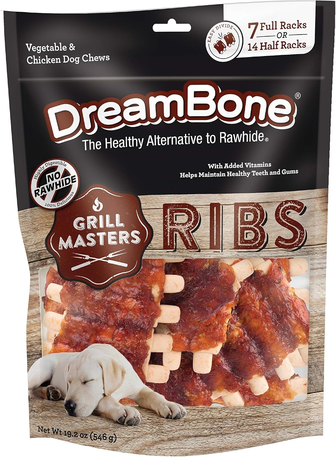 DreamBone chews have all the benefits of a rawhide chew…without the rawhide! No-rawhide DreamBone chews are made with real chicken, beef and vegetables for a scrumptious taste dogs can’t resist!Your whole family, including your furry family members, can enjoy a backyard BBQ! DreamBone Grill Masters T-Bones are a delicious combination of real beef and irresistible BBQ flavor that your dog will love. These 100 percent rawhide-free, vitamin and mineral-enriched chews look, taste and feel like a real T-bone! In addition to being a tasty treat for your beloved pet, these DreamBone Grill Masters T-Bones also help maintain healthy teeth through the natural action of chewing. Treat as a reward or in-between snack to keep your pup happy and entertained while you enjoy your BBQ too! Feed your pup 1 to 2 chews per day and always supervise your pet during chewing activity.The experts at DreamBone brand want you to have healthy, happy dogs. We know that your dog is more than a pet – they’re family. Chewing is an essential, healthy and enjoyable activity for dogs. DreamBone chews help satisfy a dog’s natural chewing instinct.