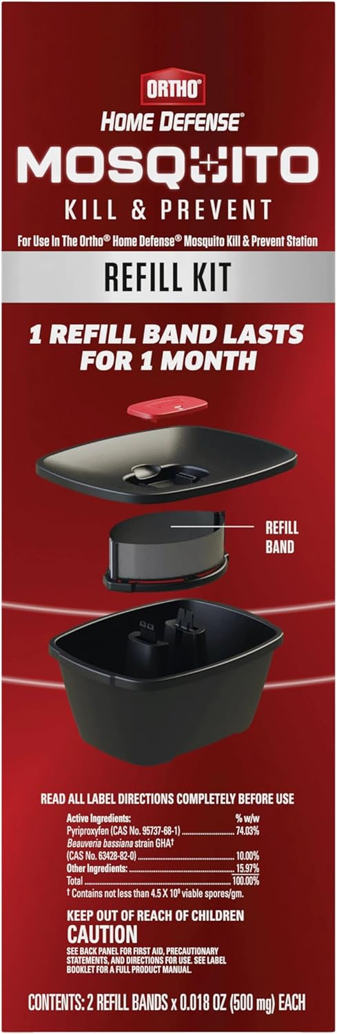Fight back against mosquitoes* with Ortho® Home Defense® Mosquito Kill & Prevent mosquito stations. This innovative device creates an ideal breeding site to attract adult mosquitoes* and prevents the emergence of mosquito* larvae. Adult mosquitoes* die within nine days after spreading the formula to other breeding sites. Backed by scientific research and available to mosquito professionals, this technology is now available at a DIY price. The active ingredients are contained and targeted, not broadcast into the air. Don't settle for short-term relief from mosquito repellents - this device controls mosquito* populations over time for a long-term solution to mosquitoes*. You don't need flames, sprays, or batteries, and this station is easy to set up and maintain. To use, simply fill the station with water and place in your yard. Attach the refill band to the floater, finish assembling the station, and you're ready to start controlling mosquitoes*. Replenish water as needed and replace the refill band every month. See label for complete directions. This station controls mosquitoes* in an area up to 4,300 sq. ft. and includes 2 refill bands for 2 months of protection. *Aedes and Culex spp