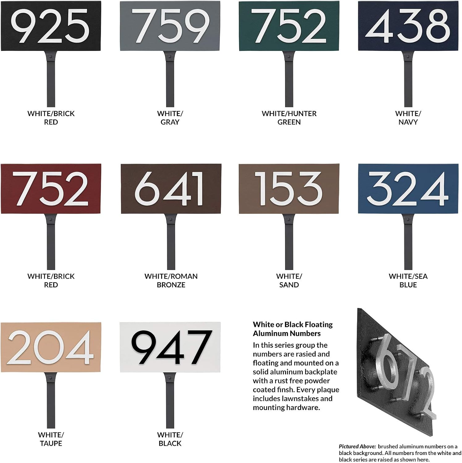 We offer 40 color combinations to choose from. Our Modern style address plaque mounted with lawn stakes is a high quality, modern style custom option without the wait. The numbers are securely fastened to the plaque on the back side with screws that are countersunk to conceal them. Forged in recycled aluminum and finished with a durable two part paint this plaque will add beauty to your home for years to come.