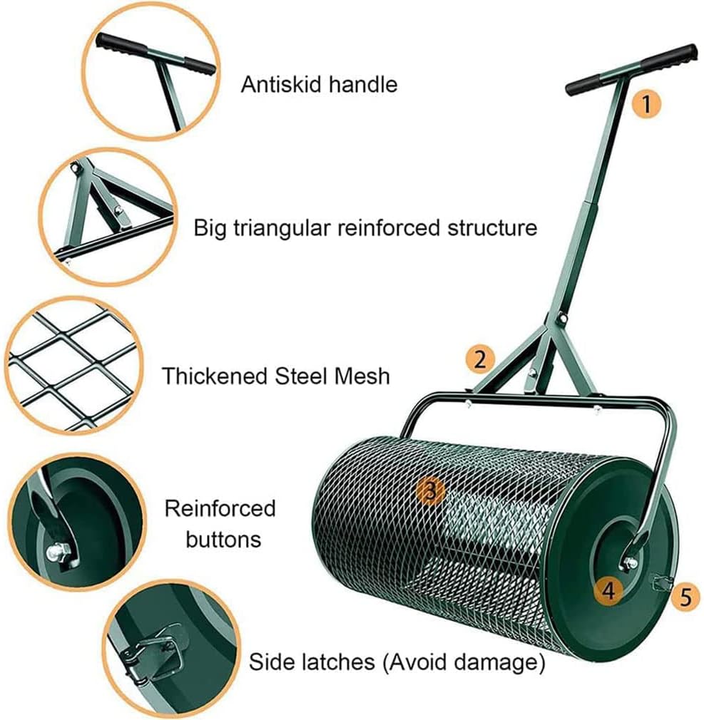 Let's walk towards our dream lawn together.Lawn and Garden Spreader makes fertilizing easier and saves you costs by allowing you to use less material to maintain your lawn! Trust lawn care and you will get a beautiful lawn.Durable QualityAll-iron construction and powder-coated finish make this peat moss spreader sturdy, rust-proof, and long-lasting. Besides, two locking clasps are firmly built to make sure it stays closed during rolling.Hinge Door to Open EasilyComplete the work without any hassle! The hinge door swing with double locking clamps opens for easy filling and stays closed during use.PVC Grip HandleThere are two grips on either end of the handle. With its non-slip and ergonomic design, this top dressing spreader is super labor-saving and makes the whole process more efficient.Specification:Material: Sturdy stainless steelColor: GreenRoller Size: 32×60 cm 12.9×23.62 inchProduct weight: 7.3 kgPackage Contents:1 x Spreaders for lawns