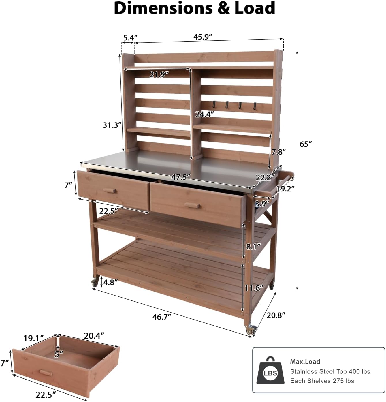 Dimensions: 52 x 22.2 x 64.9 inchesWeight: 72.75 LBSMaterial: Solid Fir Wood + 201 Stainless Steel + Metal HookColor: BrownPackage Includes: Outdoor Potting Bench Table with Stainless Steel Top, Drawers, Shelves, Hooks, and Towel RackCountry of Origin: China64.9'H Outdoor Potting Bench Table combines functionality and style for your garden or outdoor kitchen. Crafted from solid fir wood and 201 stainless steel, this waist-high bench features a spacious 47.5" x 22.2" tabletop ideal for grilling, prep work, and plant care. The modular design includes 2 large drawers, 4 removable hooks, and adjustable slatted shelves for organized storage. A propane tank rack and bottle opener add convenience, while 4 lockable wheels ensure stability and mobility. The elevated top rack displays plants or tools, and the towel rack with 3 "S" hooks keeps essentials within reach. Durable construction withstands outdoor elements, making it a versatile addition to your gardening or cooking space.