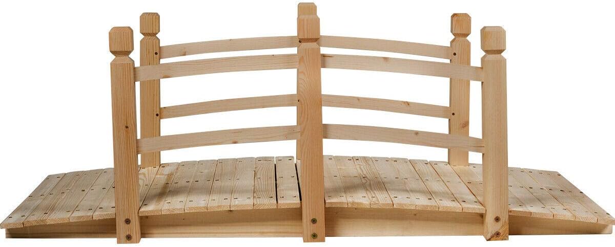 This is our new 5’ wooden bridge, which is perfect for decoration in garden, near pond or any other landscaping. The material is fir with stained finish, which looks fashionable and elegant. It can give your garden a real life-like look. Specifications Color: Natural Wooden Material: Fir Wood Overall Dimension: 5’ x 26.5’’ x 22’’(L x W x H) Wood Thickness of bridge surface: 0.55’’ Wood Thickness of bridge supporter: 1.2’’ Wood Thickness of arms: 2.2’’ Wood Thickness of rail: 0.4’’ Product Weight: 33.5 LBS Weight Capacity: 225 LB Package Include: 1 x Wooden Bridge 1 x Instruction Note: Please refer to the dimension and size of the product before purchasing. Simple assembly is required according to the included instruction. Please consider the weight capacity before stepping on it.