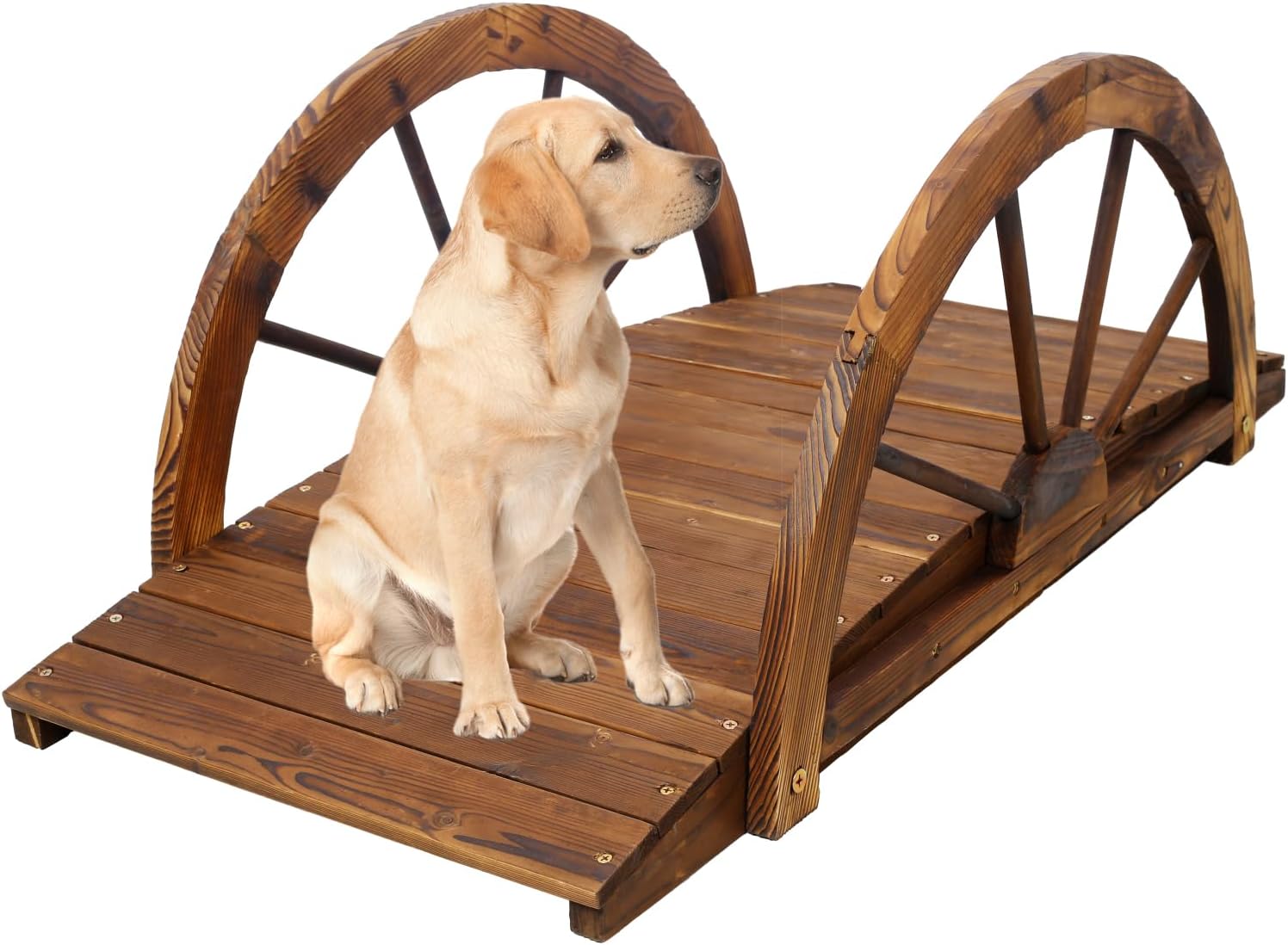 Dimensions: 3.3ftMaterial: WoodColor: BrownPackage Includes: Garden BridgeNotes: Weather-resistant treatment, supports 330 lbsEnhance your outdoor space with this 3.3ft wooden garden bridge, designed to add charm and functionality to your landscape. Its arched frame and half-wheel railings offer both safety and visual elegance, while the solid fir construction ensures durability. Treated for weather resistance, this bridge maintains its appearance over time, making it ideal for garden paths, small streams, or backyard water features. The stained brown finish adds a warm, natural touch, blending seamlessly with outdoor decor. A great choice for those seeking a timeless, decorative addition to their outdoor area.