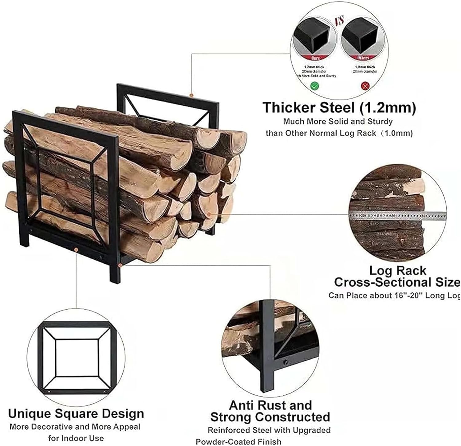 Elevate your firewood storage experience with our stylish and practical firewood rack, ensuring you always have easy access to your firewood for a warm, cozy campfire. This versatile storage rack is the ideal choice, keeping your firewood neatly organized and within easy reach. Our rack's sophisticated design complements any setting, from patios and gardens to patios and fireplaces. It boasts ample storage capacity and is elevated for optimal ventilation. Its decorative and practical design makes it a must-have accessory for your wood-burning activities. Key Features: - Enhanced Durability: Our firewood rack is constructed from thicker steel (1.2mm), making it significantly stronger than standard models (1.0mm) for long-lasting durability. - Versatile Design: Its cross-section accommodates firewood from 16 to 20 inches, and its unique square design adds a decorative touch that enhances its aesthetic. - Versatile Use: Whether you're storing, drying, or displaying firewood, this rack is the perfect companion. Keep firewood off the ground to preserve its quality. - Widely Applicable: Suitable for a variety of places, including porches, fireplaces, backyard patios, outdoor fire pits, neatly stacked firewood in the cabin, indoor garages or family rooms. Package Contents: 1 x Outdoor Firewood Rack