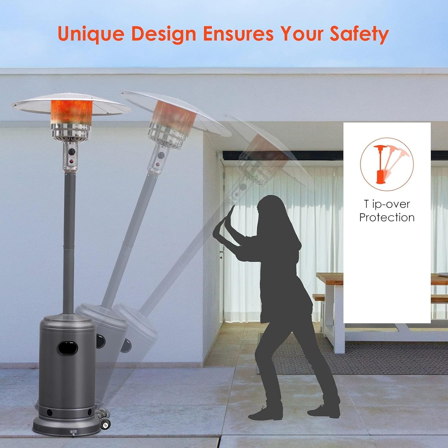 DescriptionMade from premium steel, this outdoor heater is built to last. With a high performance of 50,000 BTU, you can enjoy faster heating. It requires a 20lbs liquid propane gas tank (not included). Featuring flexible wheels and 2 handles, it's easy to transport. The anti-toppling design ensures safety during use. Simple operation and adjustable temperature settings provide a better experience. Three stakes ensure overall stability on windy days. It boasts a spacious warm area with a diameter of 15ft, making it suitable for various places such as the patio, deck, and garden.FeatureStainless steel frame for strength and durability50,000 BTU heat output for ample warmthEasy ignition and flame controlCompatible with 20 lbs standard propane cylinders for clean combustionTwo smooth-rolling wheels for effortless movementLightweight and portable for cozy gatheringsGround stakes on base for added stabilityIdeal for keeping warm on patios, gardens, balconies, and courtyardsStylish design that complements any decorSpecificationColor Options: Black/Bronze/GreyMaterial: Stainless SteelDimensions: 32 x 32 x 87 inchNet Weight: 33 lbsBase Size: 19.5” x 29”Power: 50,000 BTUFuel Type: Propane Or Butane (Burning Consume: About 1 Lbs To 2 Lbs Per Hour)Package Includes: 1 x Patio Heater