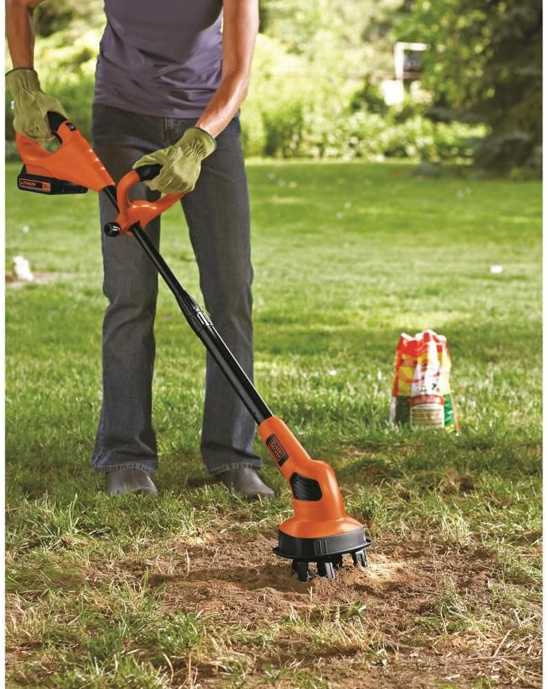 The BLACK+DECKER 20V MAX* POWERCONNECT tiller is the smart choice for cultivating garden and landscape beds, aerating soil, weeding, seeding, and planting. Prep dry spots in your lawn and revitalize existing areas—all thanks to this tiller’s range of powerful and intelligent design features. Dual tines easily maneuver between plants and prevent weeds from tangling. An adjustable, soft-grip auxiliary handle, telescoping tube, and upright orientation allow you to stay comfortable and keep fatigue to a minimum. It uses a 20V MAX* POWERCONNECT battery that powers up to 325 sq. ft. of cultivation before you’ll need to recharge it, and it’s even compatible with other tools within the POWERCONNECT system. *Maximum initial battery voltage (measured without a workload) is 20 volts. Nominal voltage is 18 volts.