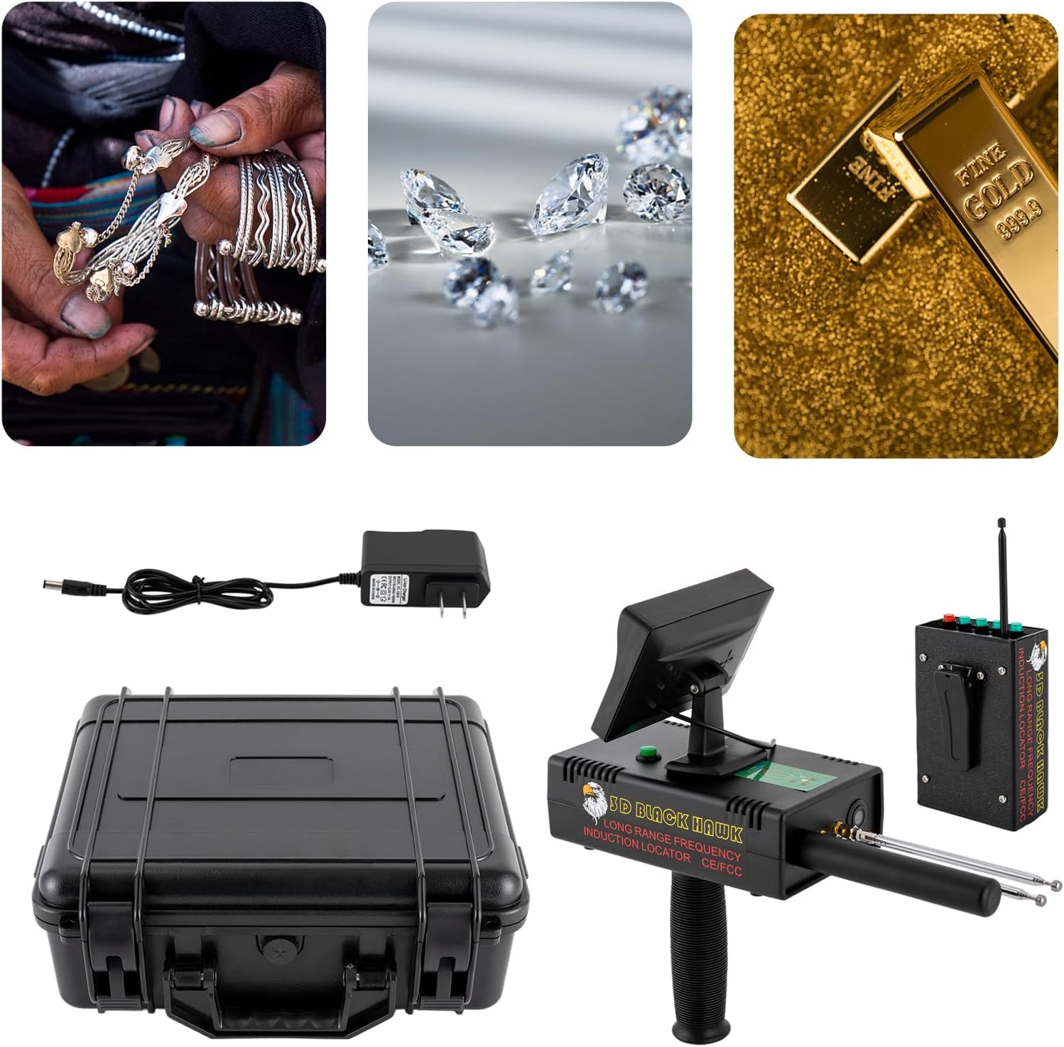 How to UseEmittersPower is the power switch button (please do not turn on the switch when the instrument is not in use). Please select the metal you want to detect: Gold, Silver, Copper, or Diam, according to the metal you want to detect (please note that you cannot select both metals at the same time, otherwise it may cause damage to the instrument).HostJust turn on the power switch. You can detect by selecting a metal category based on the origin of the transmitterHang the host vertically at your waist, keeping it as parallel as possible to your legs. If you are operating the searcher with your right hand, hang it on your right waist, and if you are operating it with your left hand, hang it on your left. Please pay attention to removing metal items such as mobile phones and keychains.SpecificationsColor: BlackMaterial: ABSBatteries Required: YesDetection Range: Around: 1200m/3937ft, Depth: 30m/98.4ftPower Source: 2000mAh Lithium Battery(Included)Display Type: LEDPlug: US StandardInput: AC100-240V, 50-60HzOutput: 12.6V, 1ATransmission Frequency: 5.6-6KHzSignal Frequency: 360-440HzDetection Type: Gold, Silver, Copper, DiamondRecommended Working Temperature: -5~45°C/23~113°FCharging Duration: 10-12 hoursUsage Duration: 4-10 hours (Depending on Whether the Screen is Turned On)Handle Length: 12cm/4.72inScreen Size(L*W): 11.5*7.7cm/4.52*3.03inProbe Length: 11.3cm/4.44inBody Size(L*H): 16.2*5cm/6.37*1.96inPackage Size: 35*14*32cm/13.77*5.51*12.6inGross Weight: 3.5kg/7.7lbPackage Included1*Metal Detector1*Charger1*Receiver1*Box1*English ManualAll Accessories for Assembly
