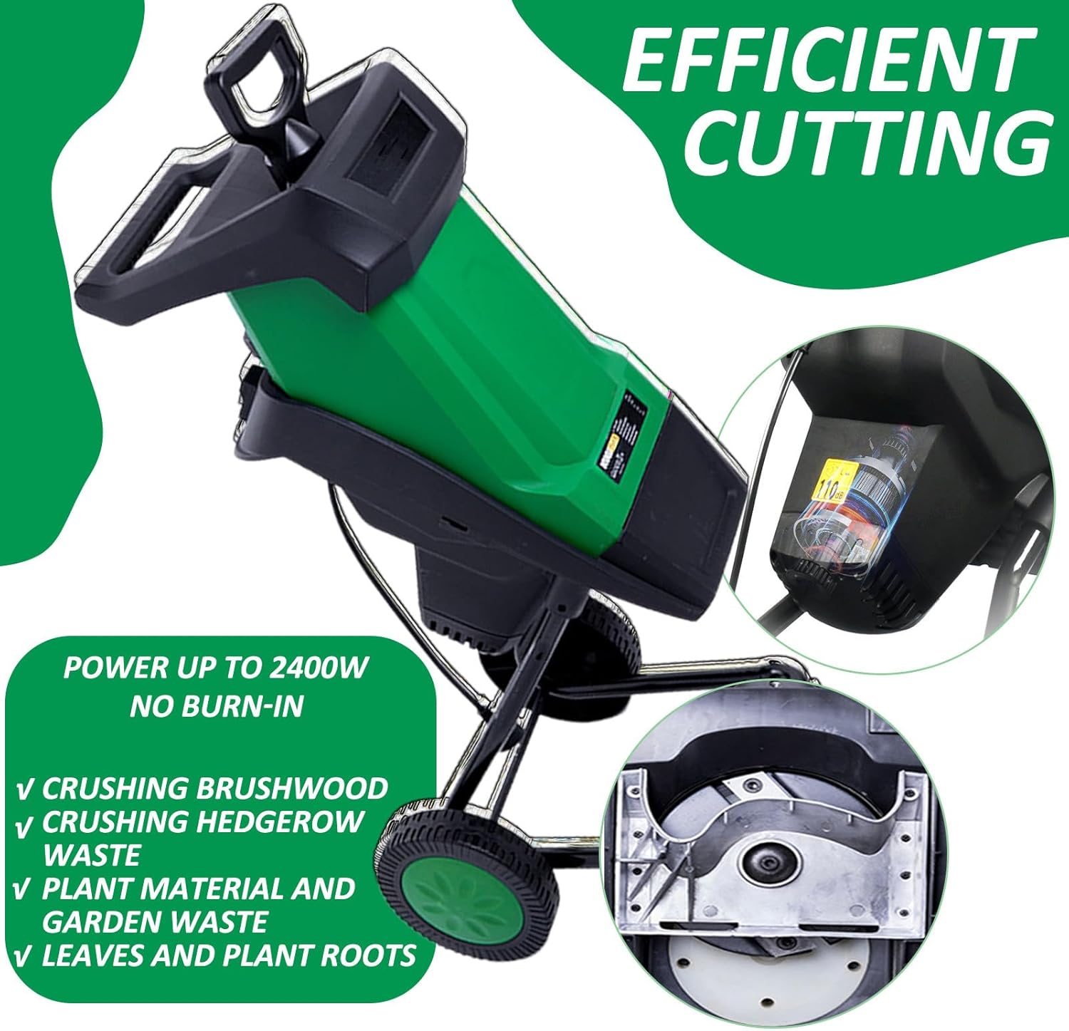 Efficiently manage your garden waste with our high-performance Electric Shredder, designed for ease of use and reliability.Specifications:- Name: Electric Shredder- Power: 2400W- No-load Speed: 4500 rpm- Cutting Diameter: 40mm- Noise Level: 110dB- Capacity: 50L- Packing Size: 64*32*38 cm- Weight: 10.7 KgPackage Includes:- 1 Garden Shredder Wood Chipper- 1 50L Collection BagPlease Note:1. The actual color of the item may vary slightly due to different monitor settings and lighting effects.2. Allow for a 1-2 cm deviation in measurements due to manual measuring techniques.