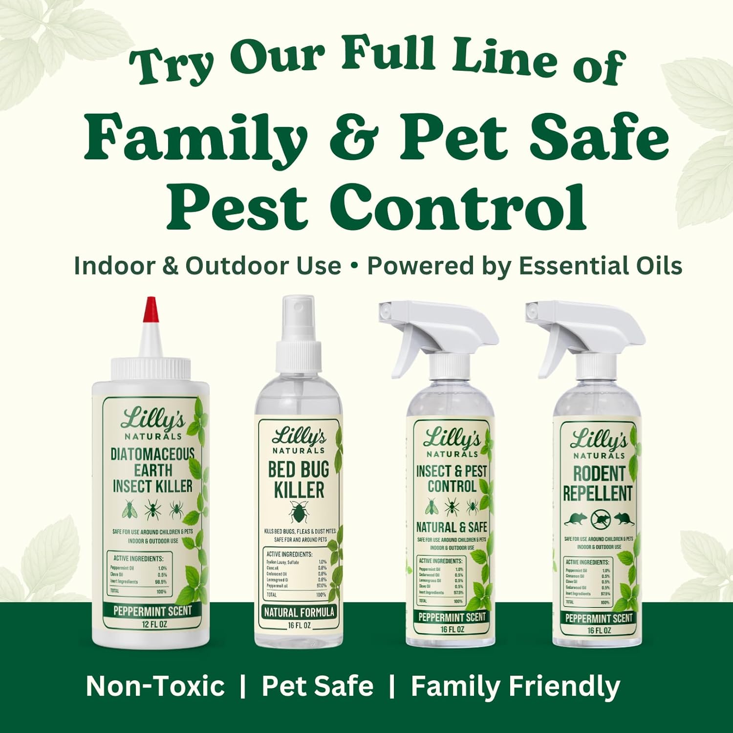 Protect your home with Lilly’s Naturals Diatomaceous Earth Food Grade Insect Killer, a safe and effective way to control common household pests. Made with food grade diatomaceous earth enhanced with peppermint and clove oils, this de powder is a trusted solution for long-lasting pest defense. Bed Bug & Flea Control Use as a bed bug killer or bedbugs killers treatment to target pests in bedrooms and living spaces. Works as a flea powder for carpets and a flea killer for house indoor, helping protect your family and pets when applied as directed. Natural, Food-Grade Quality Crafted with food-grade diatomaceous earth, this formula provides strong insect control without harsh residues. Customers love it as an insect killer that doubles as a flea powder while still being safe for households. Versatile Pest Protection Lilly’s Naturals DE works indoors and outdoors, making it easy to defend against roaches, ants, fleas, and bed bug infestations. Whether you need a flea powder for carpets or a reliable insect killer in kitchens, basements, or entryways, this product is designed to handle it all. Choose Lilly’s Naturals for a bed bug killer, flea powder, and insect killer solution that uses diatomaceous earth food grade quality—giving you peace of mind and powerful pest control in one. INGREDIENTS: ACTIVE: Peppermint Oil: 1%, Clove Oil: 0.5% iNERT: Diatomaceous Earth (Equivalent to “Food Grade”) Less than 0.1% crystalline silica: 98.5% LILLY’S NATURALS represents that product is exempt from federal pesticide registration with FIFRA 25(b) regulations.fe for use around children and pets when used as directed.