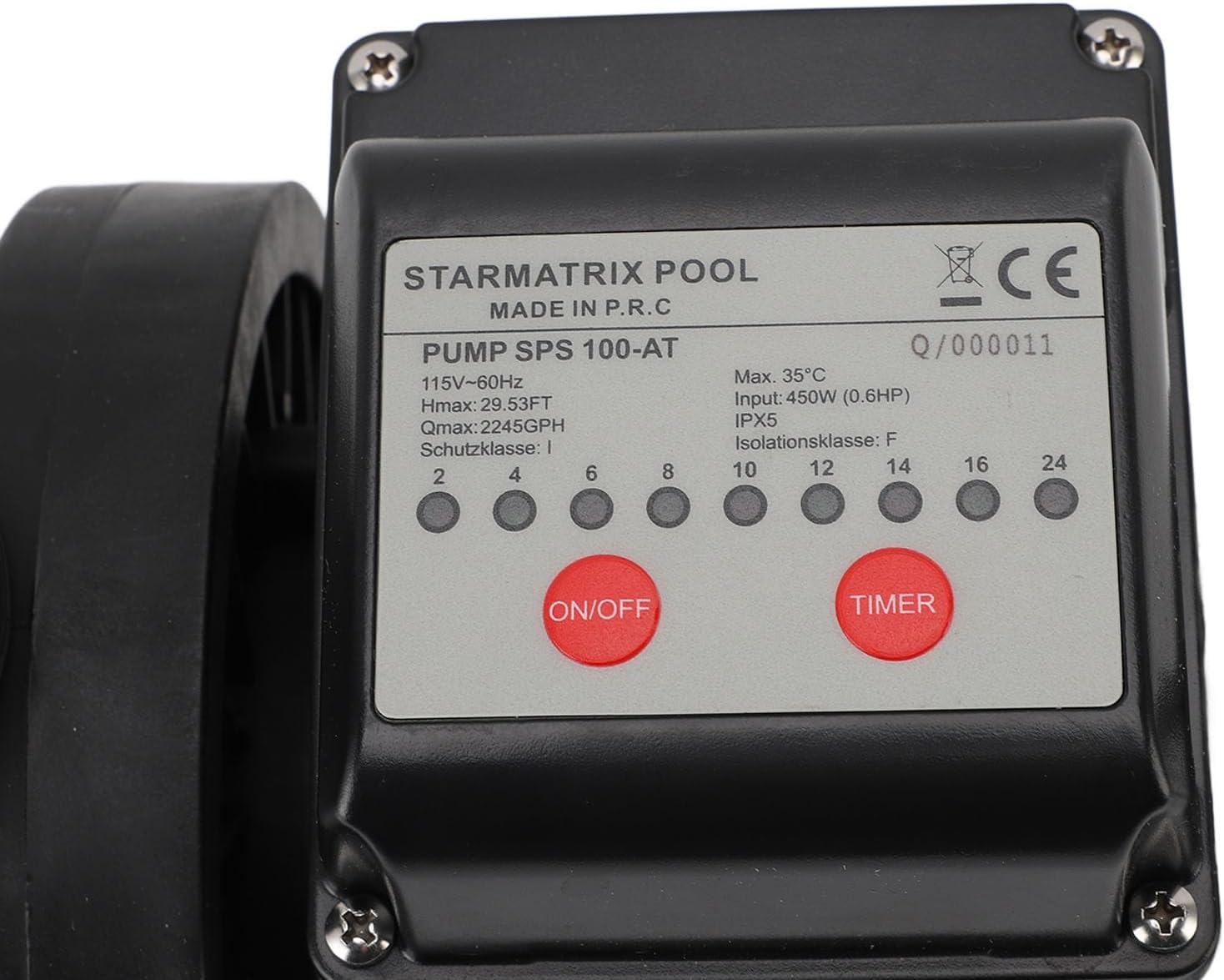 Spec: Item Type: Ground Pool Pump Material: Aluminum, Plastic Size: Approx. 41.5 x 22cm / 16.34 x 8.66in Input Power: 3/5 Horsepower (450W) Flows Rate: 2245GPH Maximum Suction: Approx. 8m / 26.2ft Maximum Diameter: Approx. 5mm / 0.2in Outlet, Inlet Diameter: Approx. 40mm / 1.57in Material: Aluminum, Plastic Timing Instructions: 1. Calculate the appropriate pump running time according to the size of the pool. 2. Wait until the time you want the pump to start. 3. Select the running time using the timer button. Then click the Start key. 4. The pump will run for the set number of hours at the current time each day. Weight: Approx. 6050.00g / 213.41oz How to Use: Plug in according to applicable voltage. Package List: 1 x Pump 3 x Gaskets 2 x Connectors 1 x Accessory 1 x Manual Note: The blinking red or green lights have no functional difference.