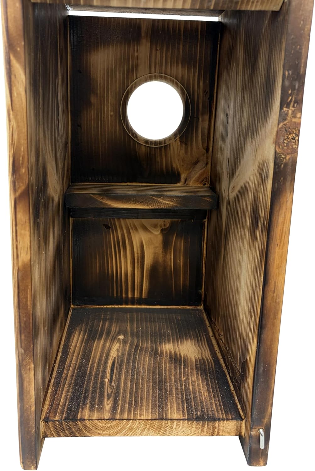 Wakefield premium squirrel houses are hand-crafted in the USA and made of Pine Wood. Pine is an ideal material for squirrel houses because it provides superior insulation during the summer and winter months while remaining light in weight and durable. Each squirrel house is carefully handcrafted by skilled woodworkers, making every piece truly unique for each customer. After assembly, each squirrel house is charred to create a carbonized layer that makes the wood resistant to rot and UV damage. Plus, this process gives each house its own distinctive character, ensuring no two are alike. Squirrels are known for providing hours of entertainment through their silly antics throughout the day; many people enjoy feeding and observing squirrels in their backyard. Squirrels will mostly use the house for nesting, as well as for protection from the winter elements. The one-inch thick wood provides insulation from both heat and cold, which is one of the leading causes of death amongst baby squirrels. Squirrels typically have a litter of 3 to 4 babies born in the spring, and occasionally give birth to a second litter later in the summer as well. The rough texture of this squirrel house makes it easy for babies to find a foot hold and climb out of the nest once they are ready. Squirrels have two peak times of activity during the day: early morning and mid-afternoon. During the winter they are most active around noontime. A great way to quickly attract squirrels to your new squirrel house is by leaving out some of our famous Wakefield peanuts near the house. Wakefield Peanuts are a favorite of many different types of squirrels and birds, making it the perfect attractant for getting and keeping animals in your yard. We recommend placing your squirrel house high up in a tree (as high as you can comfortably reach with a ladder), away from any bird feeders you may have.