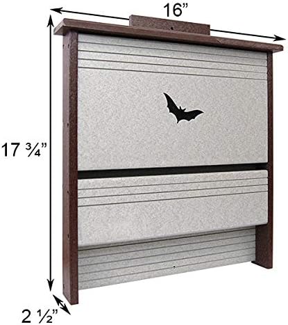 Invite a different type of pollinator to roost in your yard when you add to it this Amish Made Brown and Gray Recycled Plastic Single Cell Bat House by Prime Retreat.Wide single-chamber bat house provides shelter for up to 20 batsInterior netting throughout the 0.875" deep chamber allows bats to grip it0.5" wide ventilation gap on the front panel aids in regulating the house temperatureHorizontal grooves on the extended landing pad add more grip for bats while others on the front of the home create a cohesive lookExtended top slat and landing pad each have a single predrilled hole for easy placement against a wall or post Wide back can also accommodate an adapter for a different mounting optionLight gray front and back contrast the dark brown framing for natural and striking designAmish made using recycled plastic lumber for longevityMade in the USA. Bats that use this house: big brown, cave, eastern pipistrelle, evening, little brown, Mexican free-tailed, northern long-eared, pallid, Pallas' mastiff, Rafinesque's big-eared, southeastern, and Yuma bat Capacity: 20 bats Dimensions: 16"W x 2.5"D x 17.75"H Mounting: tree, building, or pole mount Construction: recycled plastic lumber