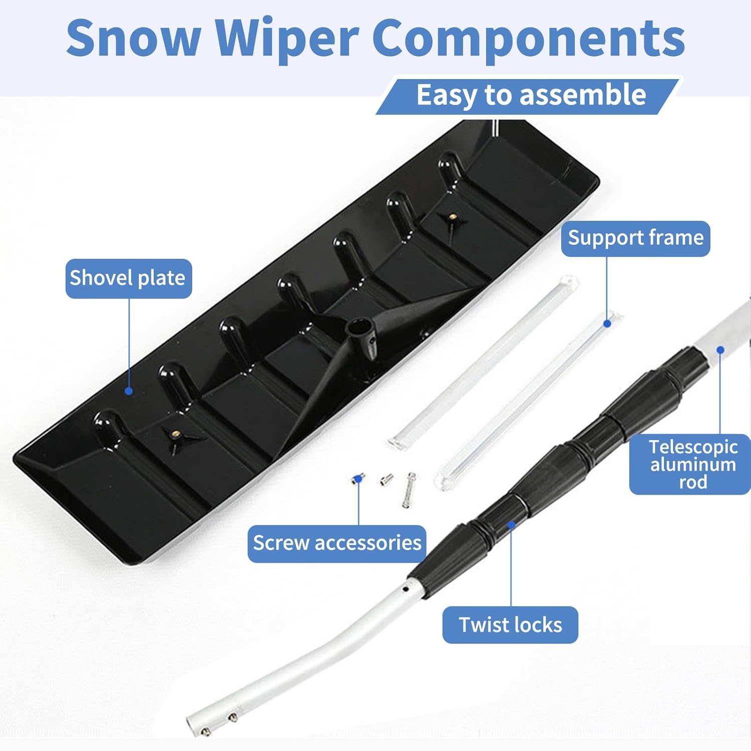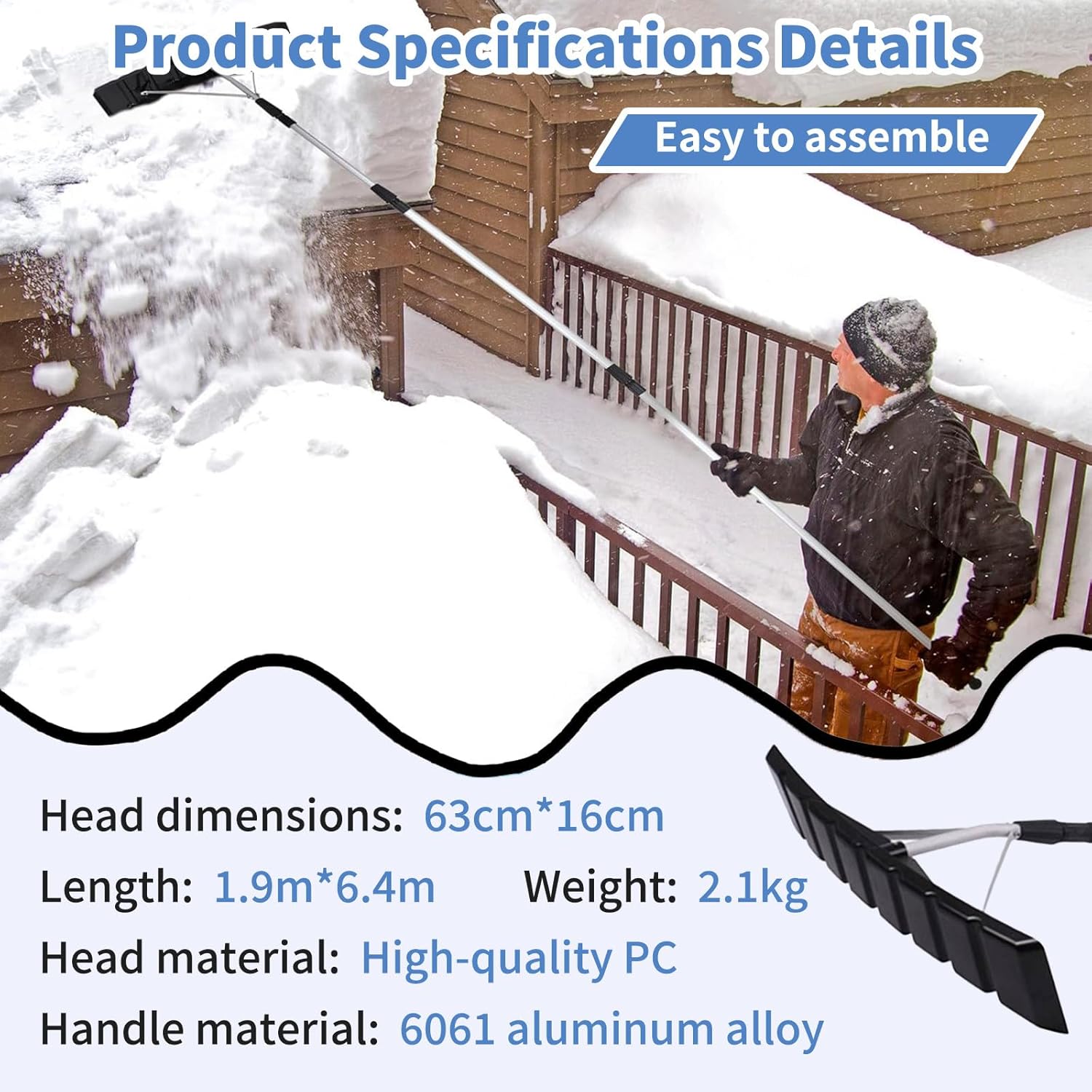 Effortless Roof Snow Removal & Versatile Outdoor Cleaning ToolTackle winter’s heaviest snowfalls and seasonal cleanup with ease using our professional-grade extendable roof snow shovel. Engineered for safety, durability, and exceptional performance, this tool is the ultimate solution for keeping your roof, driveway, garage, and outdoor surfaces clear and hazard-free.Key Features & Specifications:Optimal Snow Blade: Features a wide 63cm (approx. 25 inches) by 16cm durable polyethylene blade. Its generous size and smooth surface allow you to move large volumes of snow with each pass while being gentle on roof shingles, preventing damage during clearing.Adjustable, Lightweight Reach: The core of its design is the premium aluminum telescopic pole, extending smoothly from 6.3 ft (1.9m) to an impressive 21 ft (6.4m). Despite its robust construction and extended length, the entire unit weighs only 2.1kg (approx. 4.6 lbs), ensuring it remains remarkably lightweight and easy to maneuver even during prolonged use.All-Season Versatility: More than just a winter tool, it’s your year-round outdoor assistant. Efficiently clear fresh, soft snow from porch roofs, solar panels, vehicles, and garden sheds. In autumn, use it to quickly sweep away accumulated leaves and debris from gutters and rooftops, preventing clogs and water damage.Customer Service:If you have any questions after receiving the package, please contact us as soon as possible, we will always give you a satisfactory answer.