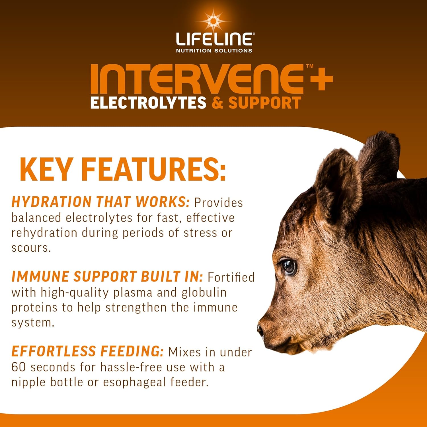 ANNUSO LIFELINE Intervene+ Electrolyte Nutritional Supplement delivers fast-acting hydration, digestive support, and immune strength to help calves recover from stress, dehydration, or digestive upset. This advanced calf electrolyte powder combines balanced electrolytes for rehydration, functional proteins for gut health, high-quality plasma to reinforce immune defenses, and prebiotics for added nutritional support. Formulated specifically for calves from day 2 onward, Intervene+ is ideal for use in calf ranches, dairies, or for individual animals needing targeted support. It helps restore hydration, improve gut health, and reinforce immune defenses to keep calves strong and resilient. The fast-mixing powder dissolves smoothly in warm water in under 60 seconds, making feeding quick and convenient through a bottle, bucket, or esophageal feeder. With twice-daily feeding for five days, Intervene+ integrates easily into recovery protocols while reducing labor and supporting faster performance rebound. When dehydration, scours, heat, or transport challenges calves, Intervene+ delivers proven hydration, immune, and digestive support to protect health and growth.