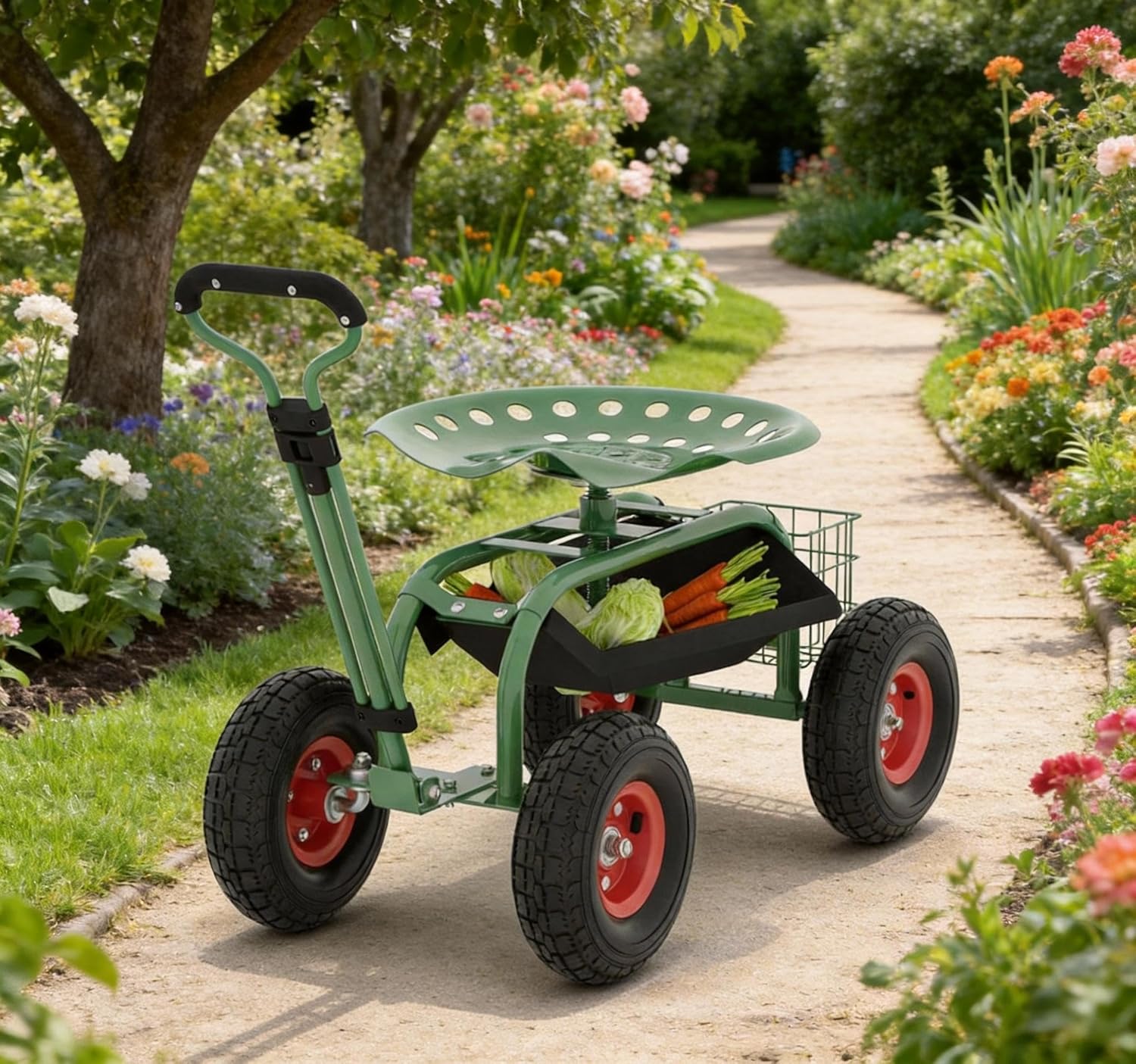 Make your gardening tasks easier, more comfortable, and efficient with our Heavy Duty Garden Scooter Rolling Work Seat—designed to take the strain out of planting, weeding, and all your yard work. Featuring a 360° smooth swivel seat, you can effortlessly change directions without standing up, while the widened, padded cushion reduces lower back pressure, letting you enjoy extended gardening sessions in exceptional comfort. Equipped with a user-friendly extendable steering handle, this garden cart offers easy maneuverability across all types of yard terrains, from lush grass to gravel paths, ensuring you can glide to any spot in your garden with total control. The 10-inch all-terrain inflatable tires, designed with an anti-slip tread pattern, deliver strong traction, allowing you to navigate over small obstacles without hassle, making even the most tedious gardening tasks simpler and more enjoyable. To keep your tools organized and within arm’s reach, we’ve included a spacious built-in metal tool basket—perfect for storing your gardening essentials like tools, seeds, gloves, and more, so you can work efficiently without constant interruptions. Crafted from reinforced 25mm cross-sectional steel, this rolling garden stool boasts a robust and durable construction that resists deformation, offers long-lasting strength, and is reliable for both indoor and outdoor use, making it your go-to companion for all gardening needs.Package Included: 1 x Garden Scooter Rolling Work Seat (with widened cushioned swivel seat), 4 x 10-Inch All-Terrain Inflatable Tires, 1 x Extendable Steering Handle, 1 x Spacious Metal Tool Basket, 1 x Set of Installation Hardware, 1 x User Manual (easy to assemble with clear instructions).