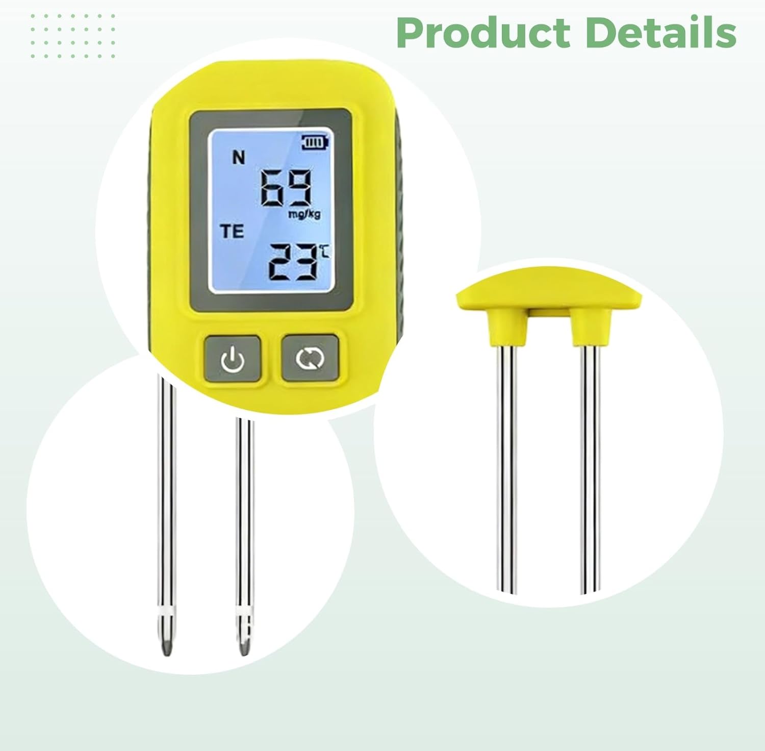 Color: Yellow Material: Plastic,Metal Size: Soil Tester: 10.6 x 2.3 in / 268 x 58 mm,Probe: 6.5 in / 165 mm Package Includes: 1 x Soil Tester Note: - Please refer to the measurement. Tiny measuring error is allowable in normal range. - There might be a little color difference due to the monitor, camera or other factors, please refer to the physical item.
