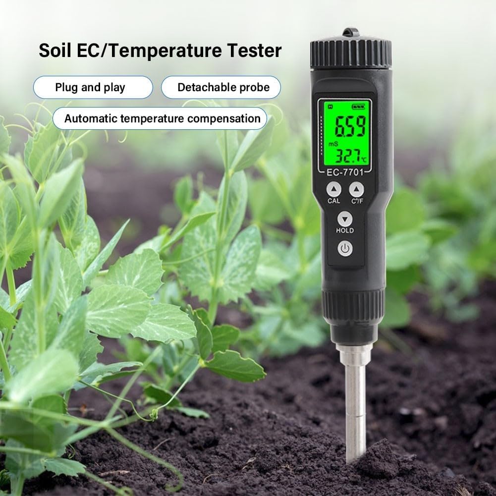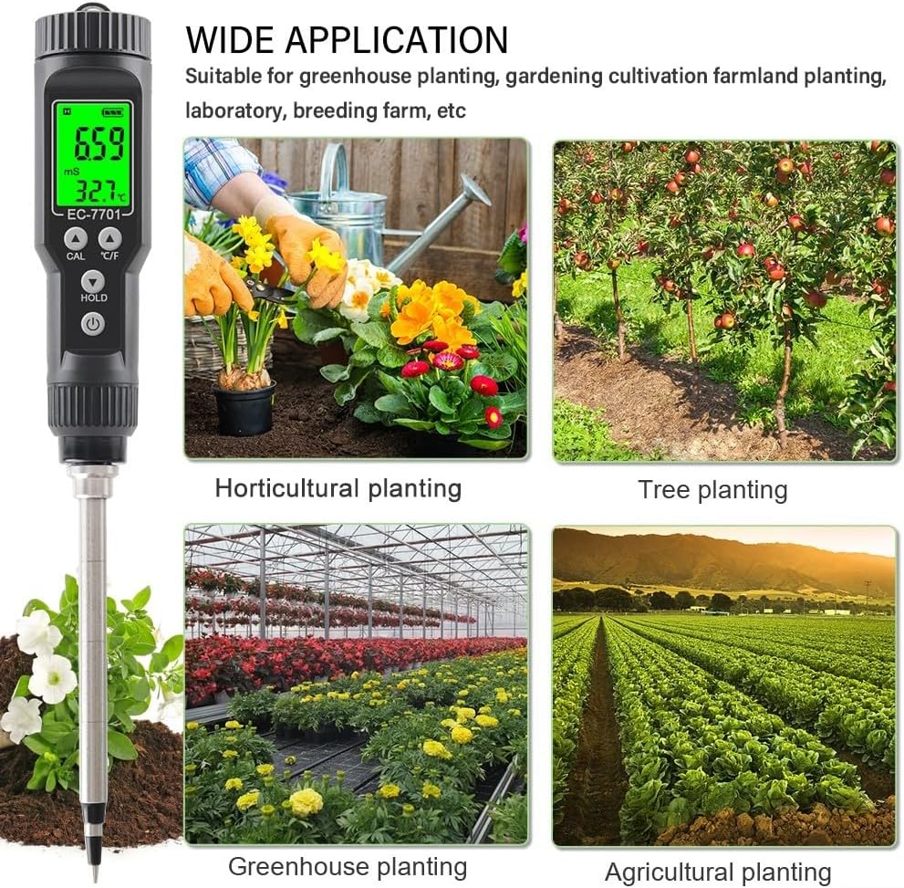 Features:*IP67 Waterproof Probe Soil Tester:This multipurpose soil meter is designed with a waterproof probe, allowing you to use it in various environments including greenhouse planting, horticultural cultivation, farmland planting, laboratory, and aquaculture.*Accurate Soil EC Measurement:The soil EC value is an important index for determining the water-soluble salt content in the soil, which directly affects the growth of crops. Equipped with a electrode, this tester provides accurate and reliable EC measurements.*Easy to Use: and play, this soil tester is easy to operate. It features a detachable probe with replaceable electrodes for easier maintenance. The automatic temperature compensation function ensures accurate readings even in a wide temperature range -30°C-80.0°C/-22°F-176°F.*Convenient Hold Function:When the value is stable, you can press the Hold button to lock the current value. This allows you to easily record and compare measurements. If you need to remeasure, press the hold button again.*Enhanced Readability:The soil tester is equipped with a high-definition backlight, providing clearer readings even in low-light conditions or at night. The rust-resistant and corrosion-resistant design makes it suitable for use in all kinds of soil conditions.Specifications:*Product Name:Probe Soil Tester EC Temperature Tester*Material:No*Size:About 280*130*37 mm(Total Length*Probe Length*Diameter)*Color:Black+Silver*Fitment:Greenhouse planting, horticultural cultivation, farmland planting, laboratory, aquaculture*Number of Pieces:1Package Content:1 * Probe Soil Tester
