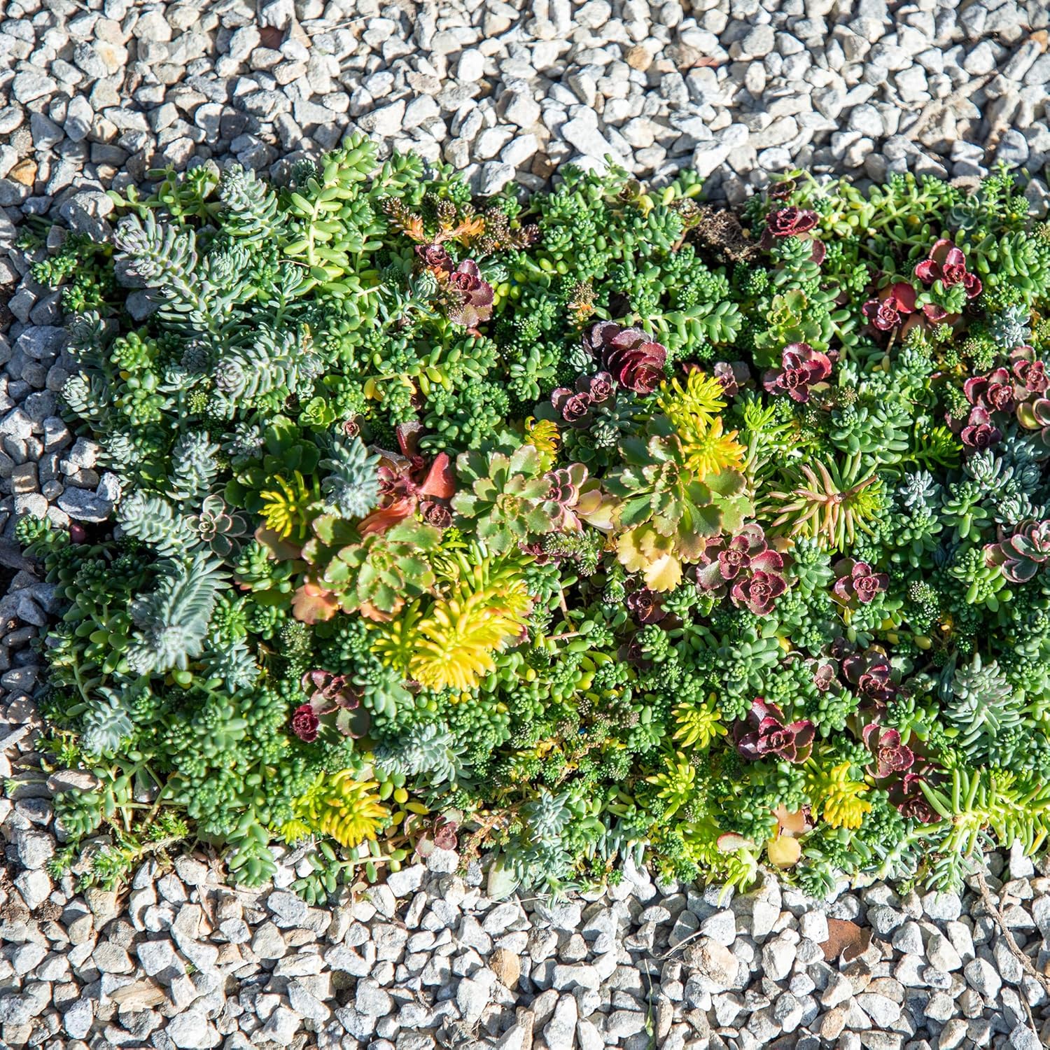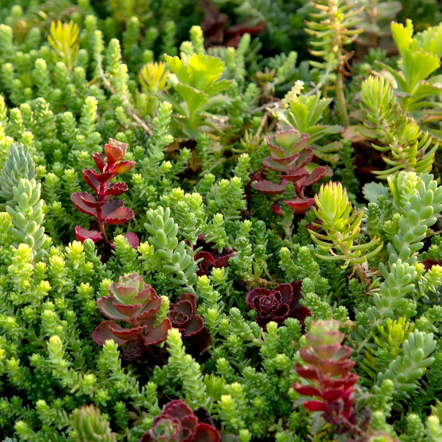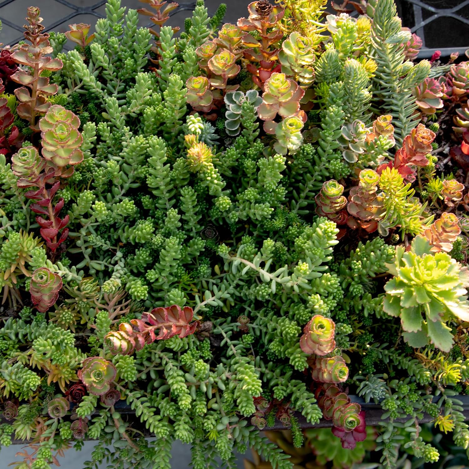 This live plant mat features a stunning combination of pre-planted sedum succulents. Complementing each other with earthy colors and contrasting forms, the various sedum in this tile wall provide natural beauty with endless possibilities for a creative and aesthetic display. Sedum plants are flowering succulents and members of the very diverse Crassulaceae family (aka stonecrop). In late spring to early summer, small, star-shaped flowers emerge from short, ascending flower shoots, contrasting the succulents’ smooth and thick, fleshy leaves. The sun-loving evergreens are known for their hardiness and ability to thrive in areas where most plants do not, so you can place this succulent wall decor almost anywhere you please, as long as there is good drainage and adequate sunlight. Sedum tile succulent planters are commonly used for vertical gardens, wall decorations, green roofs, garden planting, gardener gifts, and much more. The low-growing perennials of this tile planter are remarkably easy to care for and even thrive in neglect, making them a popular choice for plant owners of any skill. Exceptionally tolerant of drought and heat, sedum grows best with full sun and in dry, loose soil. Partial shade is tolerated, although it will affect the plants’ sturdiness and ability to flower. Water every 1 to 2 weeks, allowing the soil to dry between waterings to avoid root rot. Sedums plants tolerate a wide range of temperatures with most varieties being hardy to zones 4 - 10, and will typically begin to go dormant when temperatures drop below 50°F. In temperate climates, sedum can be brought indoors during the winter and kept at a temperature range of 60 - 70°F.