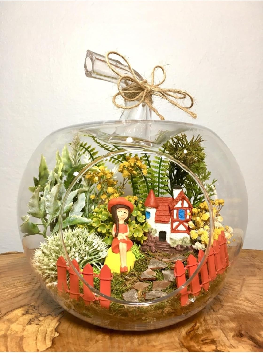 This charming terrarium features a miniature scene with a happy woman figure, making it a thoughtful and personalized gift for women. Enclosed in a clear glass container, the terrarium showcases intricate details and creates a cheerful atmosphere, suitable for home decor. The low-maintenance design ensures that it's easy to care for, even for busy individuals. The terrarium is crafted from high-quality glass, providing clarity and durability. The miniature happy woman figure is meticulously detailed, adding a touch of whimsy and personality. The combination of elements and artificial accents creates a balanced and visually appealing display. This terrarium is designed to be a conversation starter, sparking curiosity and admiration. With its compact size, this terrarium fits on shelves, desks, or coffee tables. The dimensions are carefully considered to create a balanced and visually pleasing display. The terrarium is designed to be a conversation starter, sparking curiosity and admiration from guests. Its unique design and attention to detail make it a standout decorative piece. This terrarium is appropriate for expressing appreciation to a woman. It's a suitable gift for birthdays, holidays, or as a gesture of support. The low-maintenance design makes it suitable for busy individuals who want to enjoy the beauty of nature without the hassle of constant care. It's a thoughtful and lasting gift that will be cherished for years to come. To maintain the terrarium, simply dust the glass container occasionally and ensure the miniature plants inside receive adequate light. The plants require minimal watering, typically once a month. Avoid placing the terrarium in direct sunlight to prevent overheating. With proper care, this terrarium will continue to thrive and bring joy for years to come. This terrarium offers value as a unique and decorative piece that combines beauty with a personalized touch. It's a suitable way to add a touch of personality to any space and makes a