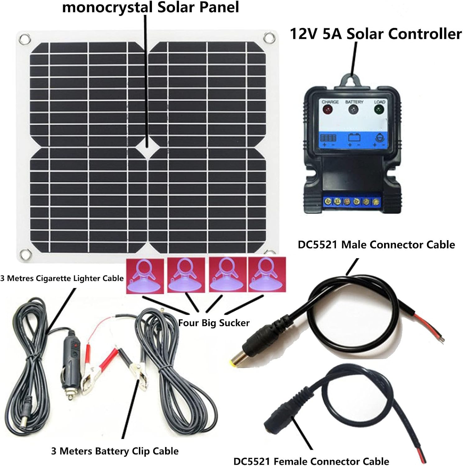 Item Type: Solar Car Battery ChargerProduct Material: Monocrystalline SiliconModel: SC1820Solar Panel Power: 18V 20W (No Load Voltage 23V)Solar Panel Output Current: Maximum 1000mA (under summer sunlight)Solar Panel Size: Approx. 360 x 330 x 12mm / 14.2 x 13 x 0.5inApplicable Battery Parameters: 12V Battery (car battery/motorcycle battery/ship battery) (without battery)USB Output: DC5VPackage List:1 x Car Cigarette Lighter Charging Cable1 x Solar Power Panel4 x Sucker1 x Positive And Negative Battery Clip Charging Cable1 x Solar Controller1 x DC Male Connector Cable1 x DC Female Connector Cable2 x User Manual