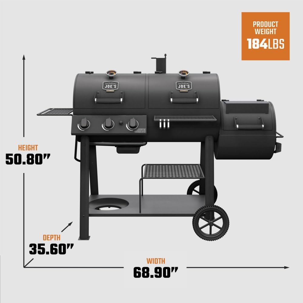 The Oklahoma Joe's® Canyon Combo Dual-Fuel Smoker & Grill (Charcoal + Gas) delivers authentic BBQ with true two-in-one versatility for outdoor cooking—smoke low-and-slow with charcoal and wood, or grill fast on a 3-burner propane gas and charcoal grill combo. With 750 sq in of primary cooking space, you can smoke up to 2 pork shoulders and grill up to 12 burgers on this Oklahoma Joe's® Grill, plus use the 281 sq in firebox grate for extra grilling room for barbecuing and smoking meat.Since 1987, Oklahoma Joe’s has been pioneering the craft of live fire outdoor cooking with a broad selection of BBQ smokers, combo grills, charcoal grills, portable grills, drum smokers, auto-feed charcoal smokers and grills, offset smokers, reverse flow offset smokers, and a range of wood and charcoal fuel, including lump charcoal, charcoal briquettes, wood chips, and wood chunks. Oklahoma Joe’s also offers a full line of grilling and smoking accessories, from BBQ prep and cooking to cleanup. Whether you’re searing a steak to perfection or throwing down a feast for a crowd, Oklahoma Joe’s has everything you need to achieve Real. Smoke. Flavor.