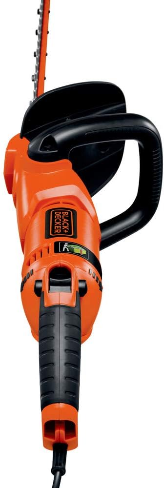 Product Description With a 180-degree rotating handle, this 24-inch BLACK+DECKER hedge trimmer can tackle tough overgrowth when trimming vertically or horizontally. Dual-action blades of the bush trimmer help you trim with less vibration compared to BLACK+DECKER single action blade models. Amazon.com Especially useful on taller and wider hedges and shrubs, the Black & Decker HH2455 HedgeHog hedge trimmer comes equipped with a long 24-inch, dual-action blade in a lightweight, 6-1/2-pound design. Not only do the longer blades offer improved reach, but a new body design distributes weight evenly to give the trimmer a light feel for control. It features a powerful 3.3 Amp motor with gear reduction for added durability and an inline motor design which delivers improved balance, control, and precision. Rear handle rotates 180 degrees with five optional stops (see larger image). New body design distributes weight evenly to give the trimmer a light feel for control (see larger image). Shearing blades cut branches up to 3/4-inch thick (see larger image). This HedgeHog trimmer is strong enough to cut through branches up to 3/4 inch thick, and the dual-action, pre-hardened steel blades provide faster cutting speed while also dampening vibration by 40 percent for comfort. The rear handle rotates 180 degrees with five optional stops to provide added comfort while trimming vertically or sculpting. The HedgeHog has a with a lock-on switch for continuous running, a lock-off switch to prevent accidental starting, and a built-in cord retention system to avoid accidental unplugging. It also features a full wrap-around bale handle with soft rubber grip and 2800 cutting strokes per minute. It comes fully assembled, and is backed by a 2-year warranty.What's in the BoxHH2455 HedgeHog hedge trimmer