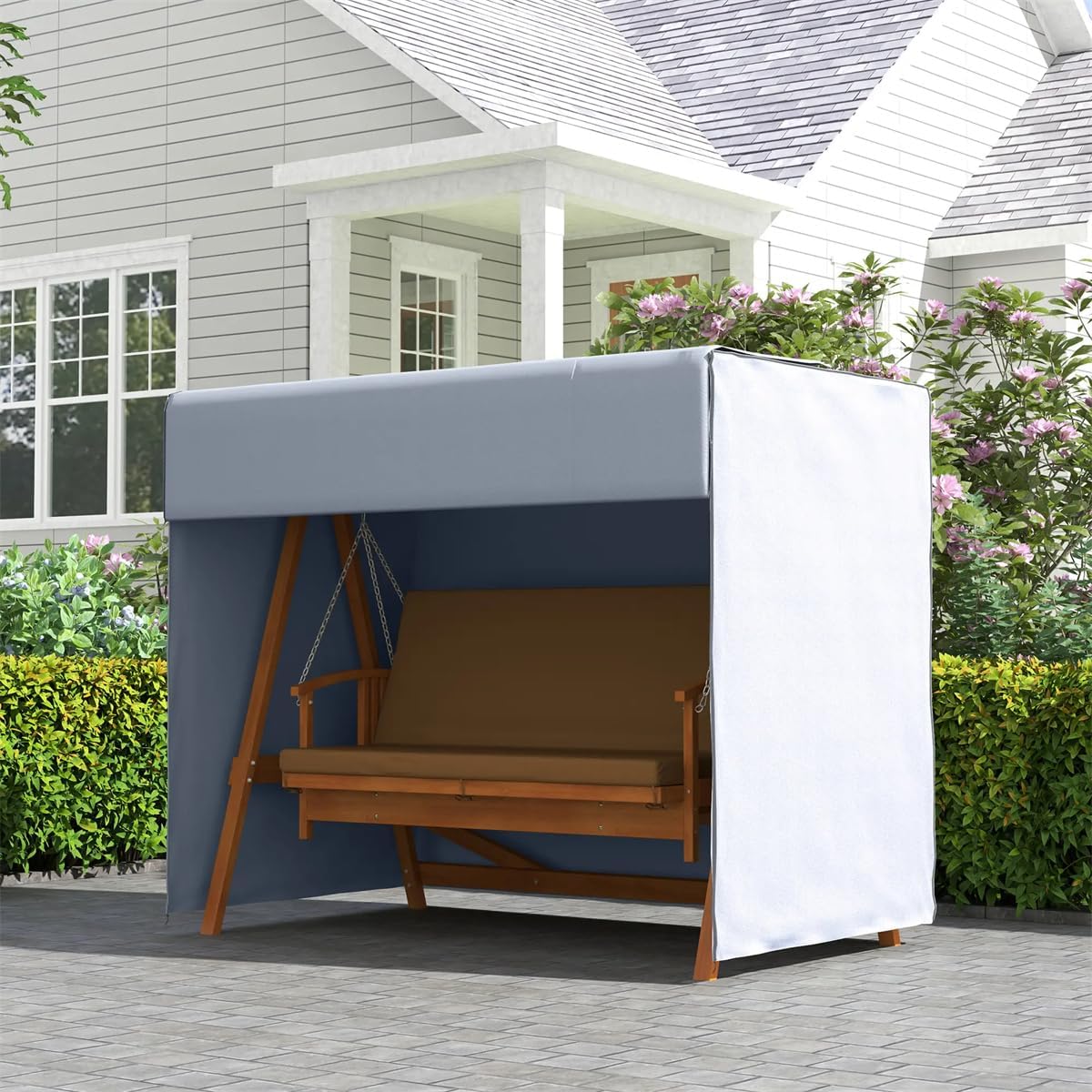 ● Protects Outdoor Swing Chairs: This patio swing cover keeps your furniture in top condition for years to come.● Use Conveniently: With the drawstring and cord locks, you can easily adjust the tightness of this hammock swing cover to fit your specific chair. The large zippered opening makes it easy to use.● Uv Resistant & Breathable: This outdoor chair cover stops sunlight from fading furniture in the summer. Breathable fabric for better ventilation.● Easy to Fold and Store: A boxy structure and oxford fabric of the swing chair cover is very easy to fold when not in use. This makes it easy and convenient to store while not in service.● Patio Swing Hammock Cover Dimensions: Overall Dimensions: 80.75"L x 48.75"W x 64.5"H. Door Dimensions: 80.75"W x 60.75"H. Specification: Color: Dark Gray Material: Oxford Cloth Overall Dimensions: 80.75"L x 48.75"W x 64.5"H Door Dimension: 80.75"W x 60.75"H