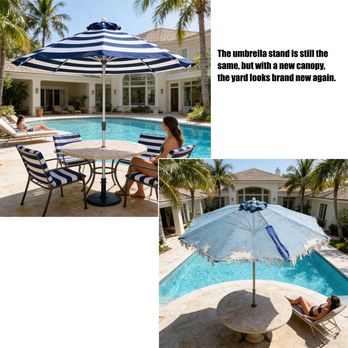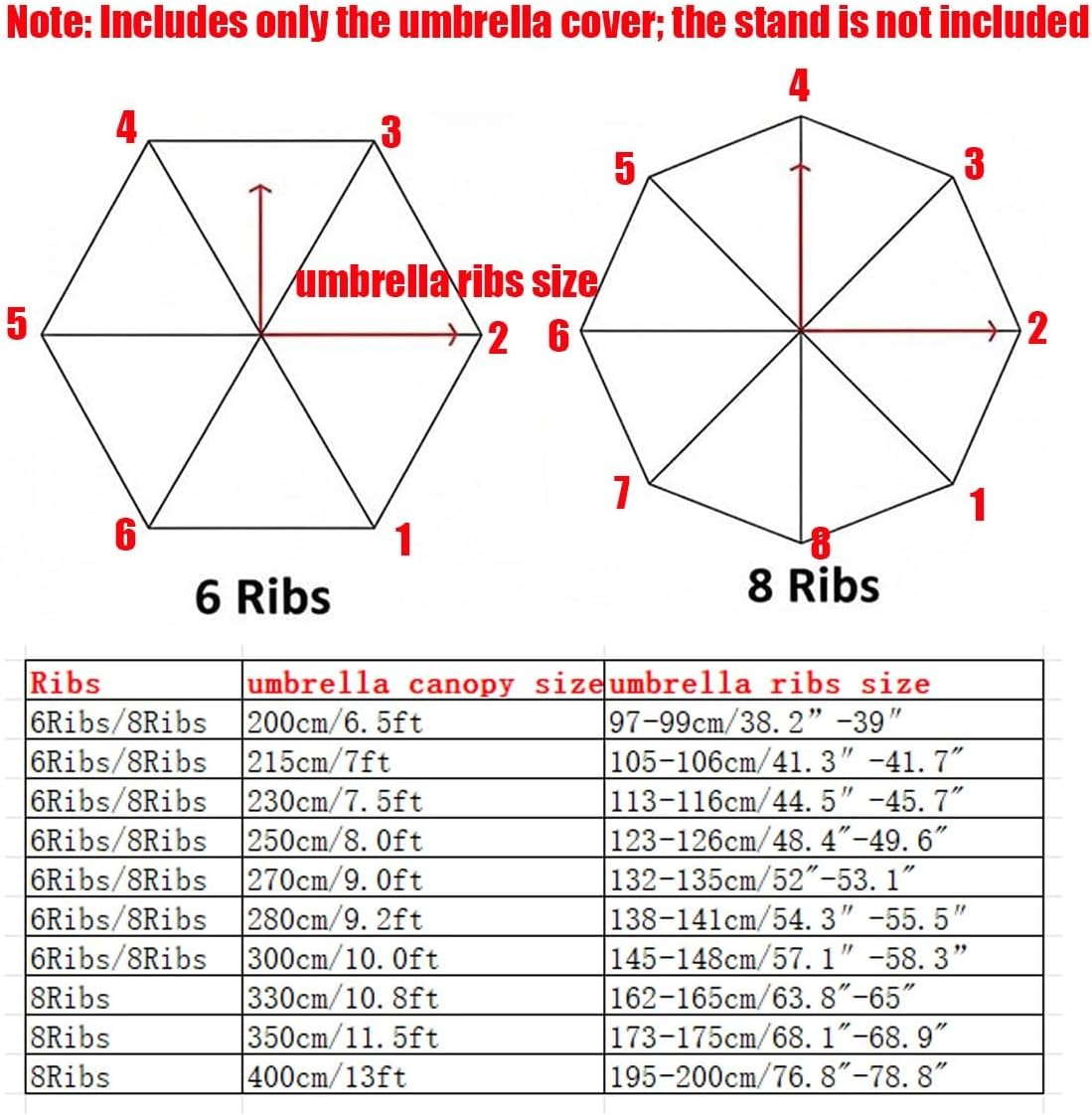 The patio umbrella canopy has long pockets with double stitching to hold the ribs securely and ensure longevity and stabilityDifferent sizes of umbrella cloth are suitable for umbrella racks:(Be sure to carefully measure the number and length of the umbrella ribs before placing an order)6.5 ft: suitable for umbrella rib length of 38.2"~39"7.0 ft: suitable for umbrella rib length of 41.3"~41.7"7.5 ft: suitable for umbrella rib length of 44.5"~ 45.7"8 ft: suitable for umbrella rib length of 48.4"~49.6"9 ft: suitable for umbrella rib length of 52"~53.1"9.2 ft: suitable for umbrella rib length of 54.3"~55.5"10 ft: suitable for umbrella rib length of 57.1"~58.3"10.8 ft: suitable for umbrella rib length of 63.8"~65"11.5 ft: suitable for umbrella rib length of 68.1"~69.3"13 ft: suitable for umbrella rib length of 76.8"~78.8" Package Include: 1× Umbrella Replacement Canopy Covers Cloth Only (umbrella ribs, pole and top finial are not included)