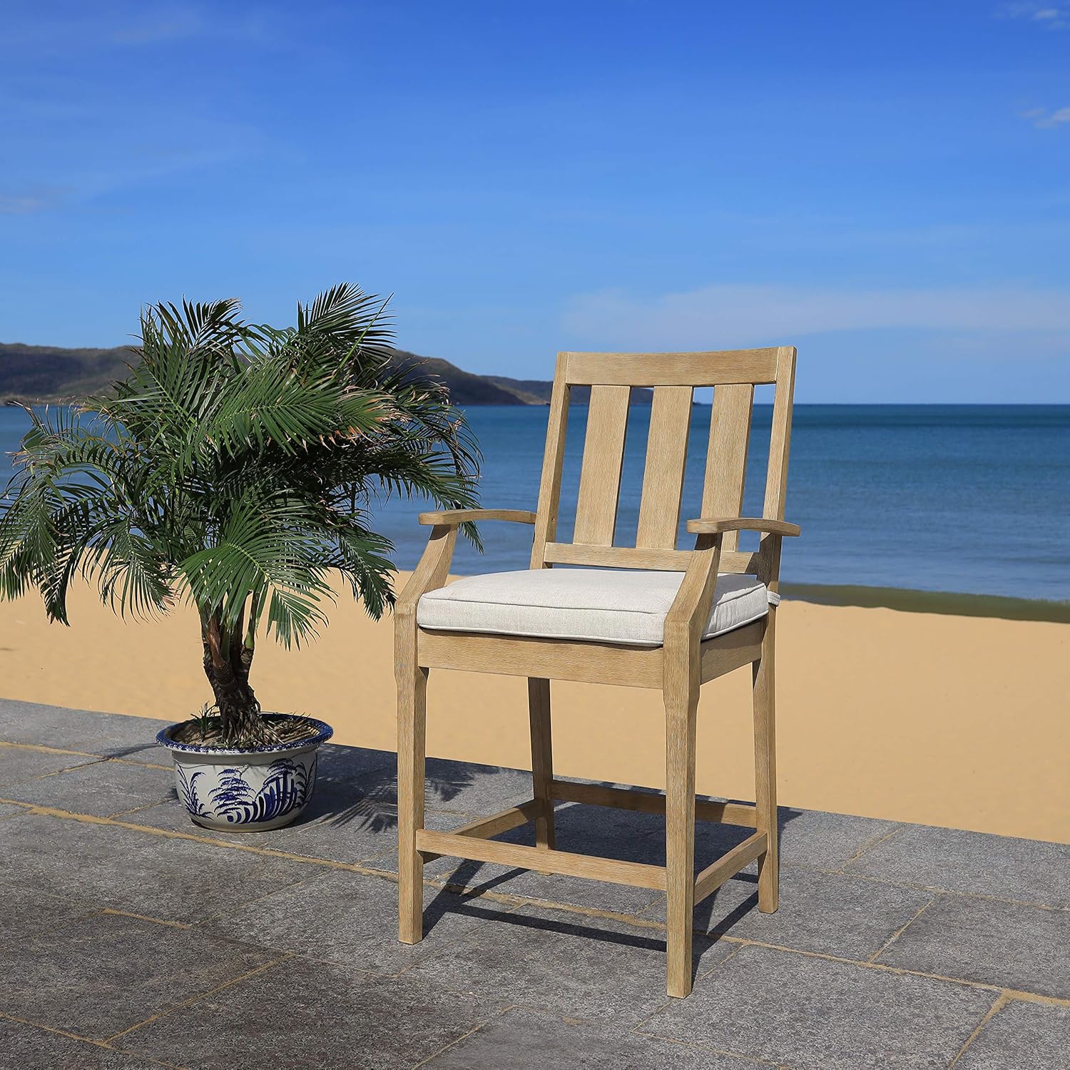 A toast to tropical vacations, the San Salvador Patio Counter Stool is inspired by the outdoor cafes where entertaining tales accompany cold cocktails. This sturdy and stylish outdoor counter stool is made using natural eucalyptus wood and sold in sets of two for designer-smart decorating.