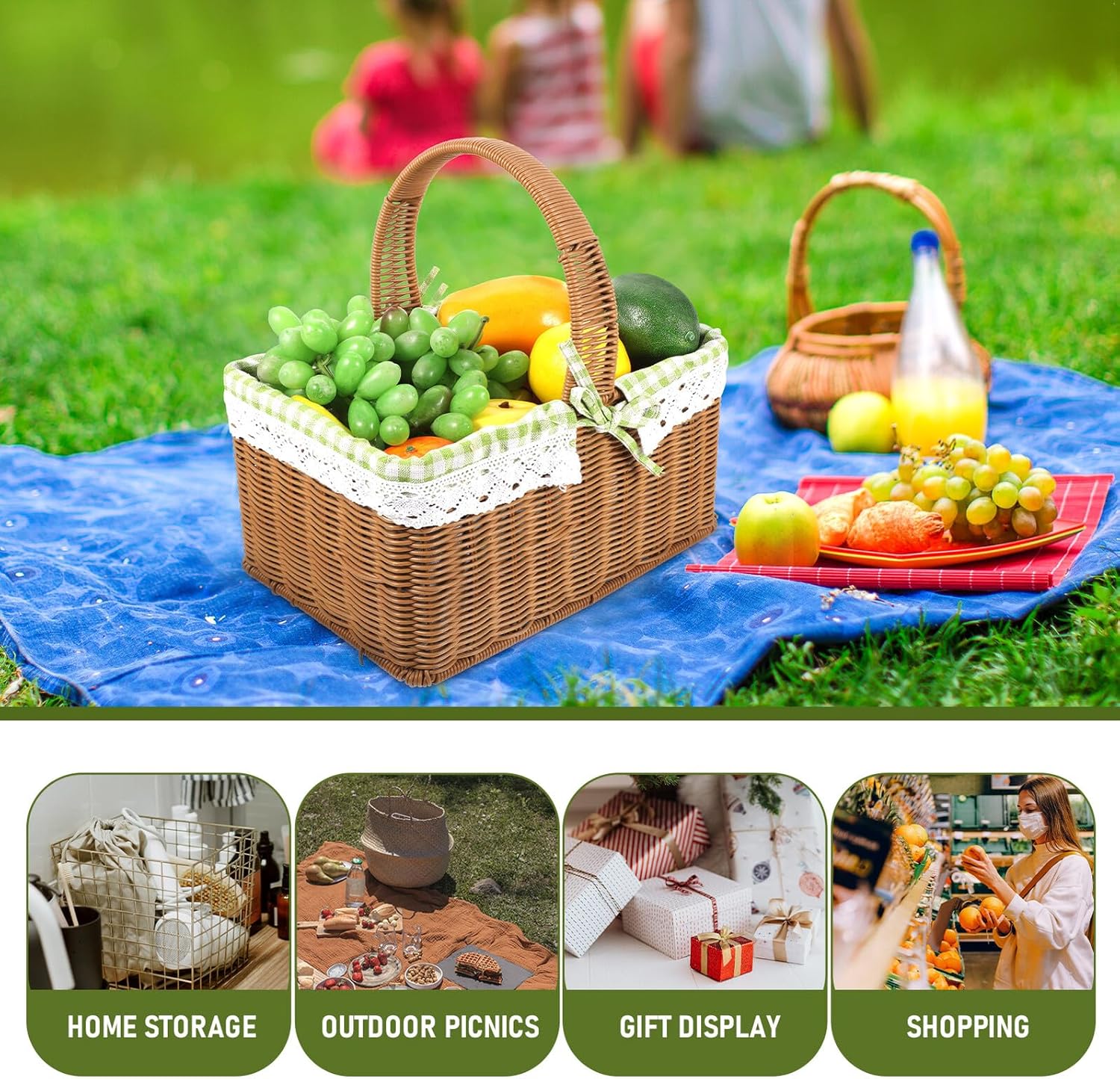 Package Include 1 x Woven Basket Characteristics -Product Info:Imitation rattan basket -Material:Straw, Cloth -Size:30.00X20.00X32.00cm/11.79X7.86X12.58in -Color:Coffee -The storage basket is made of and is sturdy and durable to last a long time. -Made of safe material, durable, delicate, strong. There is a handle for easy movement and carrying. -Great for home decoration, office, restaurant, wedding basket, fruit shop and more camping basket. -Bringing a rustic and vintage feel to picnic trips, our baskets with handle are perfect for romantic picnics, outdoor parties, road trips multi-purpose harvest basket. -Our storage basket is superbly finished to withstand sunlight and harsh winter temperatures without fading, frosting or cracking basket for picnic.Goods Informationhandheld woven basket This basket will add a fresh feeling to your room.garden baskets gathering vegetables Perfect for decorating your living room, bedroom, etc.bread basket This is a hand woven storage basket, which is made of reliable material, very premium and durable for use.garden basket It can also be used to store fruit, vegetables and other items