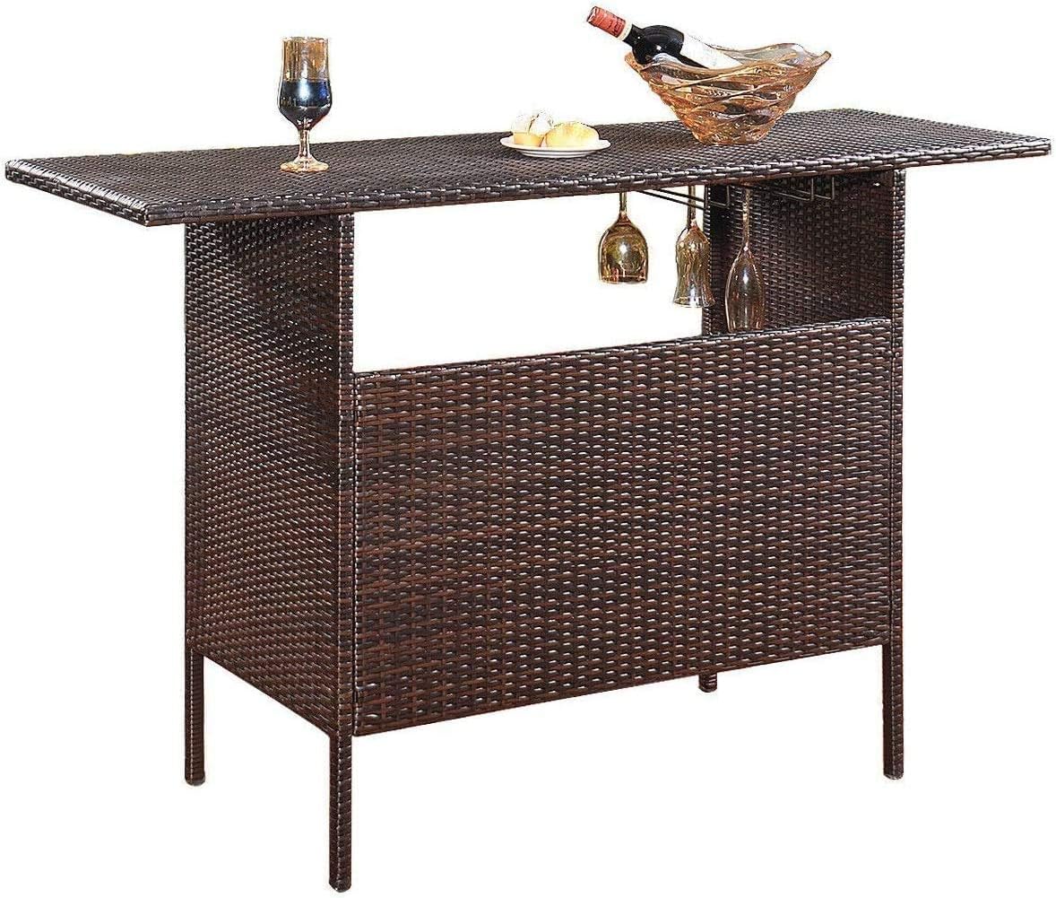 Product DescriptionOur Brown Rattan Bar Table Is Made Of High Quality PE Rattan Material, Which Will Be Lightweight And Eco-Friendly. The Rattan Material Is Also UV Resistant And Water Resistant So It Is Able To Withstand Moderate Weather But May Need Extra Protection Against Extreme Weather. It Has Two Shelves Under The Table Top For Storage. It Will Be Additional To Your Outdoor Living Space, Such As Patio, Garden, Backyard, Pool Side. Do Not Hesitate To Buy One!FeatureHigh Quality Rattan Material, Eco-Friendly And LightweightUV Resistant And Water Resistant Rattan MaterialTwo Steel Shelves Under Table Top For StoragePerfect For Outdoor Living Space, Such As Patio, Garden, Backyard, Pool SideAssemble RequiredSpecifications:Color: BrownMaterial: Rattan And SteelMaterial Of Rattan: PEOverall Dimension: 55.1"X18.5"X36.2"(LXWXH)Product Weight: 43lbs