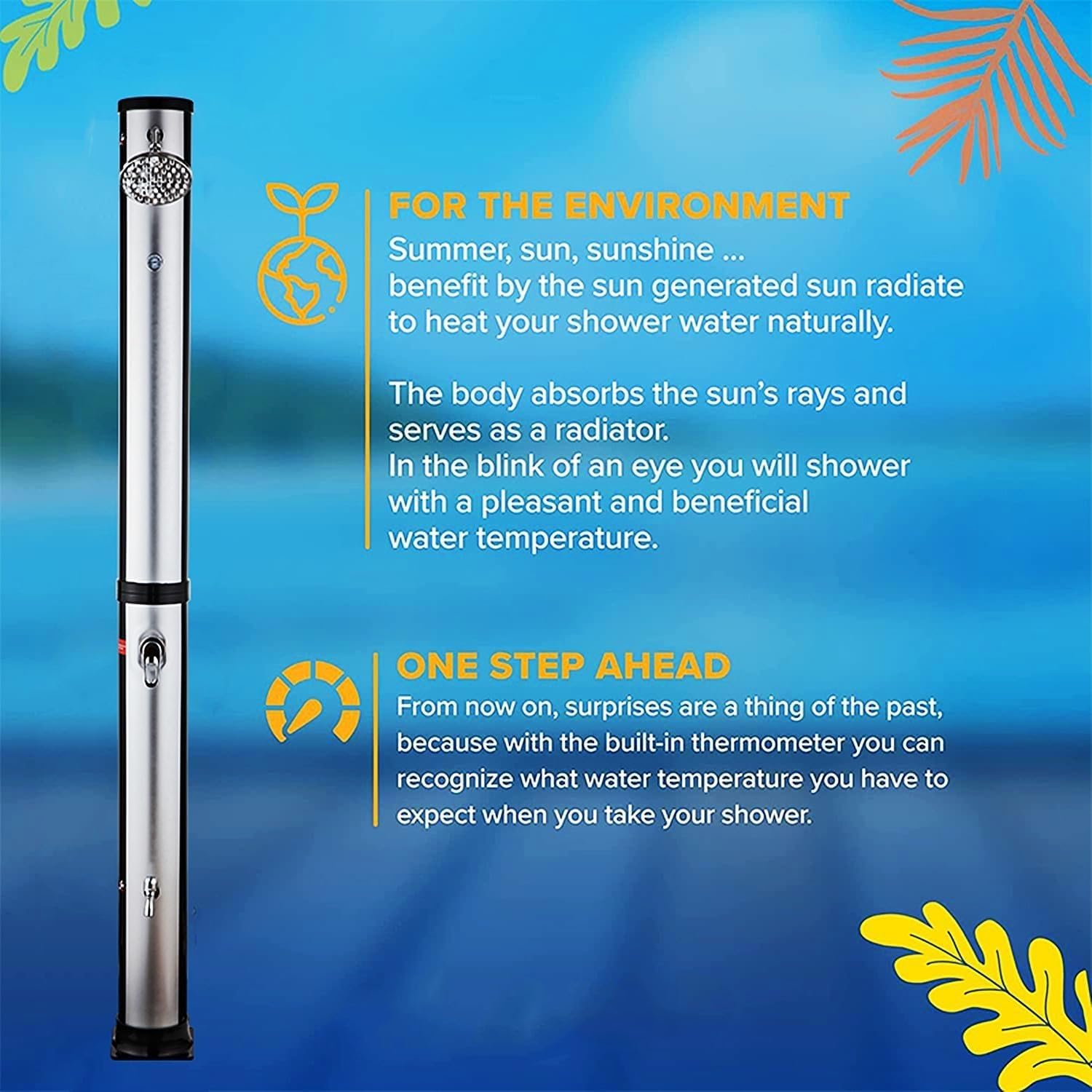 Perfect for rinsing off before or after a swim. Its sleek design makes it an attractive addition to your garden or pool area.Specification:Product Name: Garden ShowerColor: Black + SilverMaterial: PVC+Brass body+Zinc bibcockCapacity: 38LWater maximum temperature: 60 ABS hower head size: 15cmSize:217X22X22cmBottom plate size: 22X22X0.8cmWater pressure: 3.5 barWeight: 8kgPackage:1* Solar Outdoor Showernote:Regarding the color: the product picture is taken in kind, but there may be a little color difference due to different lighting displays, etc. Please understandAbout size: The size of the product is manually measured, there may be an error of about 1-2cm, please understand