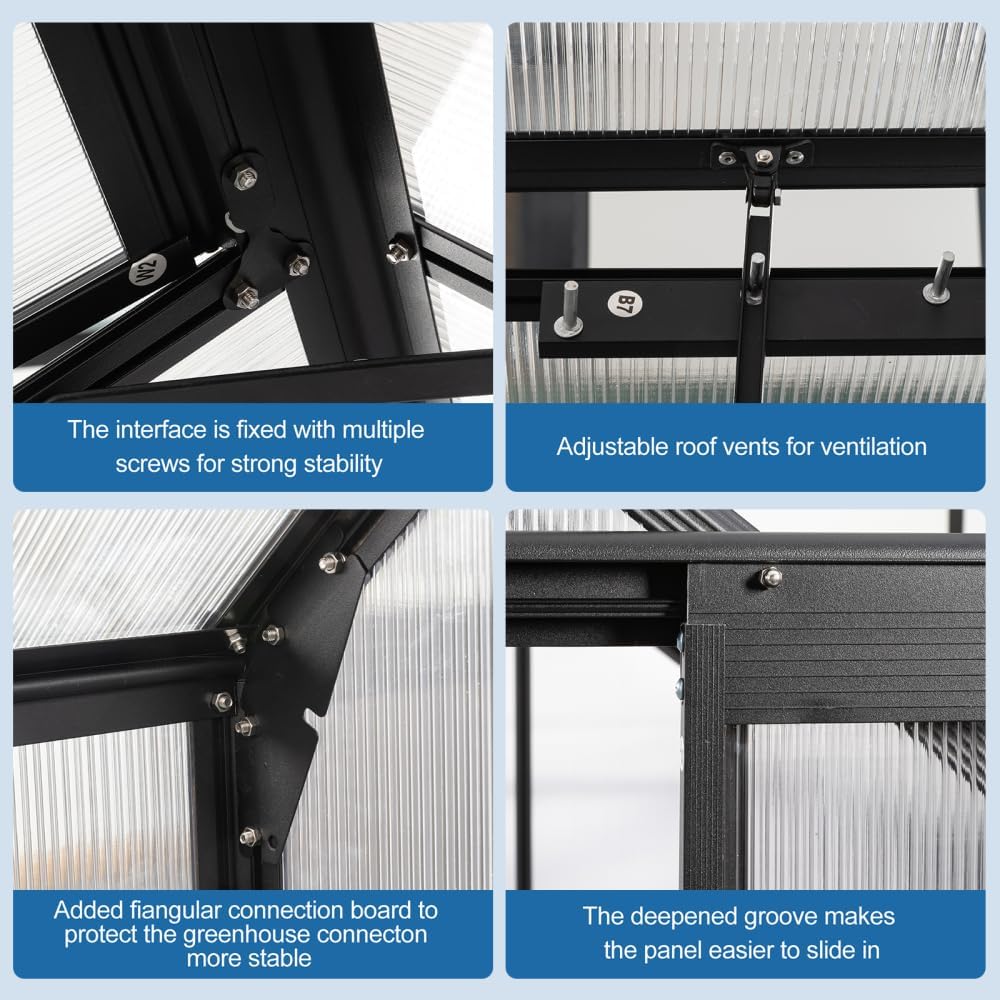 [Drainage System & Galvanized Base]The drainage gutter system can effectively drain water from the greenhouse to the outside. The sloped roof won't accumulate water on the top. alvanized base can be better fixed in the soil and protects the greenhouse from bad weather. [Sliding Door]The sliding door makes you easier to get in and out, also protects your plants or flowers from animals or pets getting inside. All detailed instruction are included already, so you can simply follow instruction to assemble. [Adjustable Roof]An adjustable roof is convenient for insects to come inside to collect pollen, helping to sow seeds and also providing fresh air at all time. A great ventilation system is built for your plants. [Heavy-duty & Durable Frame]The 4mm thick polycarbonate board can withstand outdoor temperature from -20℃ to 70 ℃, allowing enough sunlight to pass through and isolating most UV rays. The aluminum alloy frame with powder coating is more durable, won't get rust. The panels allow up to 70% light transmission for optimal plant growth while blocking out over 99.9% of harmful UV rays. [Walk-in Spacious Greenhouse]The ideal growing environment is large enough for you to plant numbers of plants, flexibly arrange your plants and flowers inside. Protecting your plants from frost and excessive heat, the green house creates a greenhouse effect to achieve and the best results of planting.