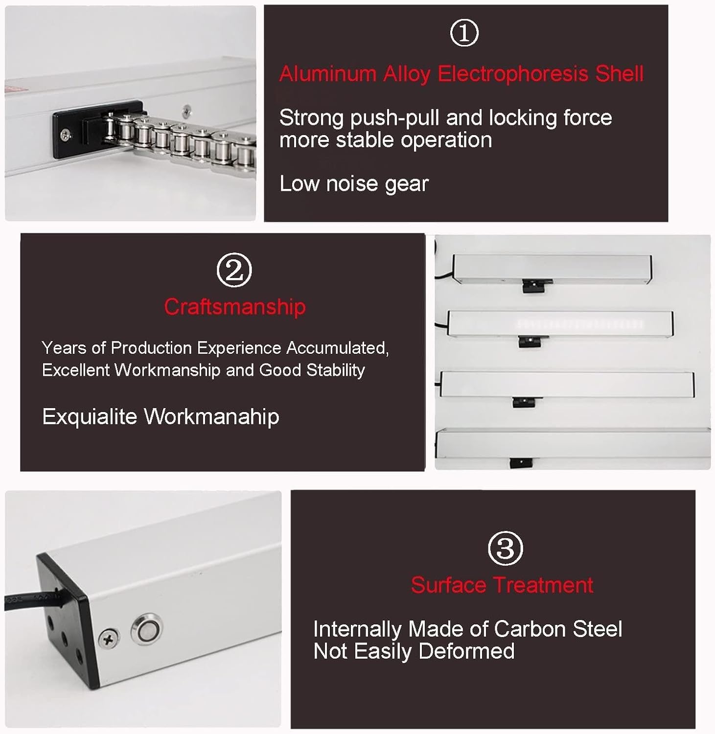 When you have a high opening or skylight, this electric chain window opener can help you control it simply by pressing a button from anywhere in the house. Suitable for skylights, hanging windows, high-altitude window sashes and various windows that require natural ventilation and smoke and heat exhaust. 【Features】 Generous and exquisite appearance design Double-layer metal chain, more stable and smooth ope-ration Wireless remote control, more flexible and convenient to use Various installation methods. Can be used for horizontal push, top hanging, middle hanging, bottom hanging and skylight Design life load more than 10,000 times opening and closing Locking force is 400N 【Specifications】 Rated power: 24 W Overload protection: 1.2A Protection level: IP32 Pressure and tension: 400N (40 kg) Chain maximum distance: 300mm, 400mm, 500mm, 600mm, 700mm, 800mm, 1000mm Working speed: 10 mm/s. Working temperature: -10°C to 75°C 【Package Contents】 1 * 24v dc window opener motor 1 * Mounting bracket 1 * Remote control 【Note】 1. The size is measured manually, with an error of 1-3 cm. Thank you for your understanding and support. 2. The installation must be performed by professionals.