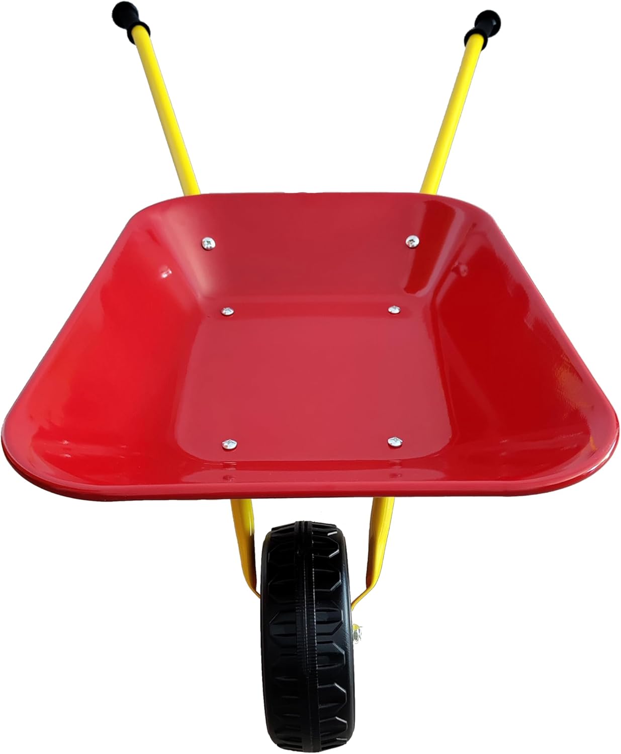 This heavy duty red metal wheelbarrow unicycle is built for tough outdoor tasks. Its steel tray and reinforced frame handle heavy loads like soil, sand, and leaves with ease. The single wheel design offers excellent maneuverability, while the rust coating ensures durability. gardeners, landscapers, and DIY enthusiasts !