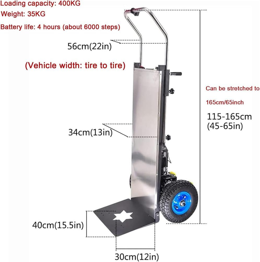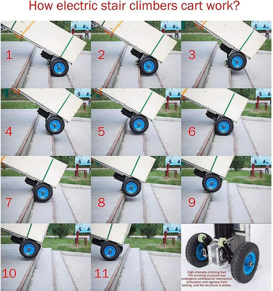 This loader climbing artifact is easy to use and saves time. It is widely used for moving up and down floors of household appliances, furniture, beverages, air conditioners, refrigerators, hardware, flour, liquefied gas tanks, floor tiles, marble, cement and other items and equipment.Specification:Products: electric transport stairs, climbing vehiclesExpanded size: 165*59*50cmFolded size: 125*35*50cmMaterial: thickened square tube + rubber wheel.Weight capacity: 170 kg.Instructions for beginners (★Remember: After receiving the product, please practice using it first.!):1. When you receive the product for the first time, please do not move blindly. After receiving the machine, make sure to empty the car training unit by going up and down the stairs, mastering the skills and then moving the cargo.2. Please practice slowly on an empty car first, and then gradually increase the weight. After receiving the product, do not move large items such as refrigerators immediately. Easy to roll over and cause injury;3. If you feel that the inversion force is too large when carrying weight, you can lower the armrest, adjust the position of the center of gravity, and reduce the inversion.manifest package:1 x electric stair climber1 x battery1 x charger1x manualPrecautions:1. The measurement data is for reference only, and the actual data received shall prevail.2. The appearance/color of the product is slightly different, and the specific appearance/color is subject to the actual product received.3. The product style is the style shown in the main picture.