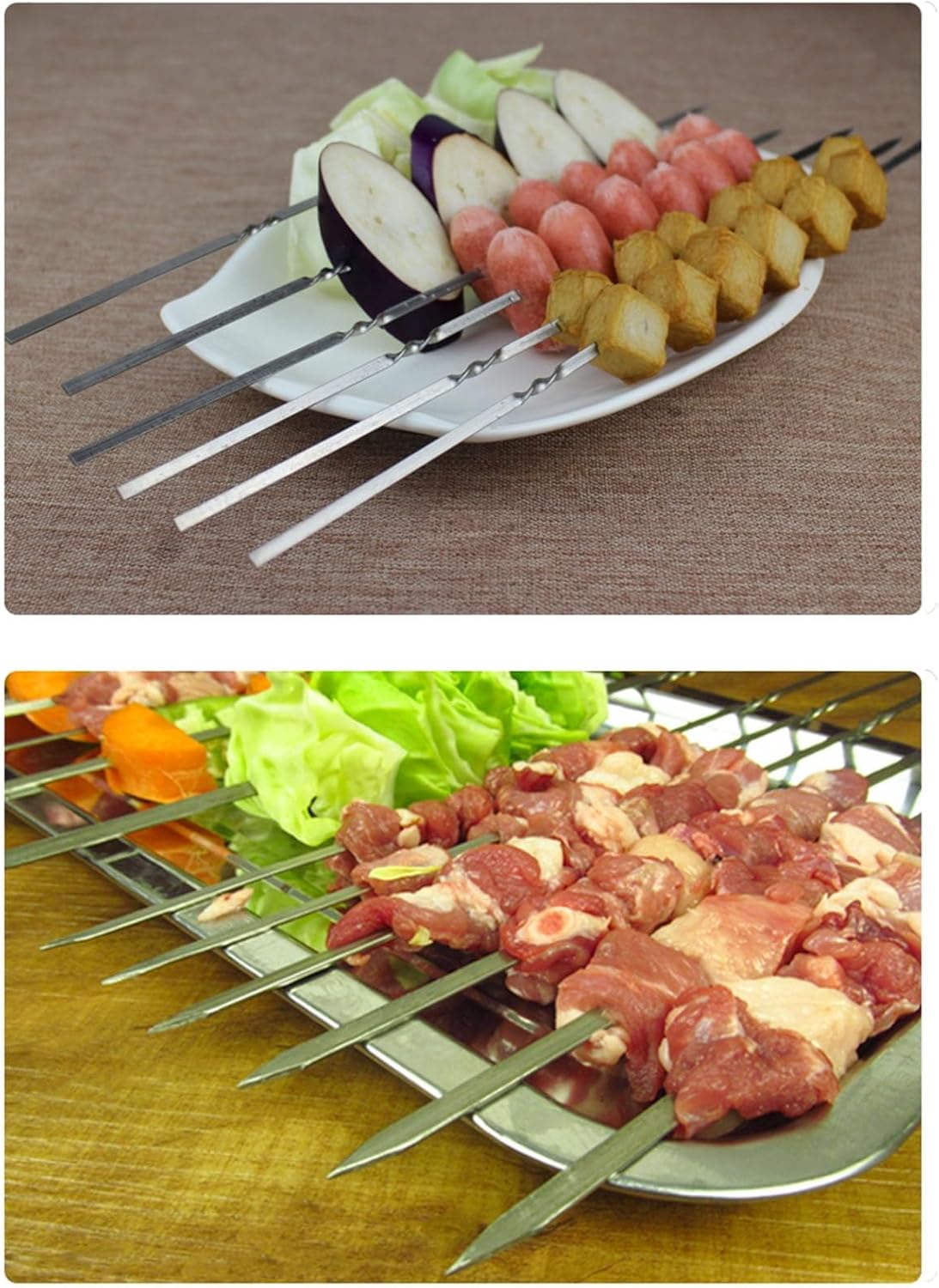 Can be used with beef, fish, pork, carrots, onions Metal shish kabab skewer is of solid one-piece design. The bbq kabob sticks is thick enough, allowing you put more weight on each skewer without getting bent or twisted. Stainless steel barbecue skewers allow for complete rotation so the food can be evenly heated and seasoned on all sides. Ergonomic Handle Design BBQ skewers are simple and beautiful, comfortable grip, non-slip, barbecue more convenient, easy to clean. Applicable Place BBQ, camping, pool side grill, take them to parks, outdoor recreation, road trips and more. Note: Due to manual measurement, please allow small size errors, thank you for your understanding Chromatic aberration occurs due to different light, shooting angles and monitors. Please refer to the actual product received. Steel stick polishing Xiao tip will leave a small amount of steel powder, just wash with water before use.