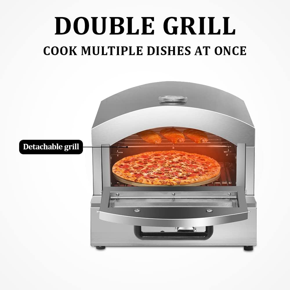 Grilling Outdoors Incredible Favors Pizza in Your Backyard Propane-Powered Pizza Oven Large, open design concept for oven space Works with any gas grill, burner, or gas stovetop Bake up in minutes on its 12-inch pizza stone with adjustable flames Heats up fast and cooks quickly You don't need to wait to crispy pizza at once Easy to clean up Specification Material:Stainless Steel Size: 18.7" x 17" x 16" Item Weight: 26lb Highest Temperature: 752? Pizza stone size: 12"