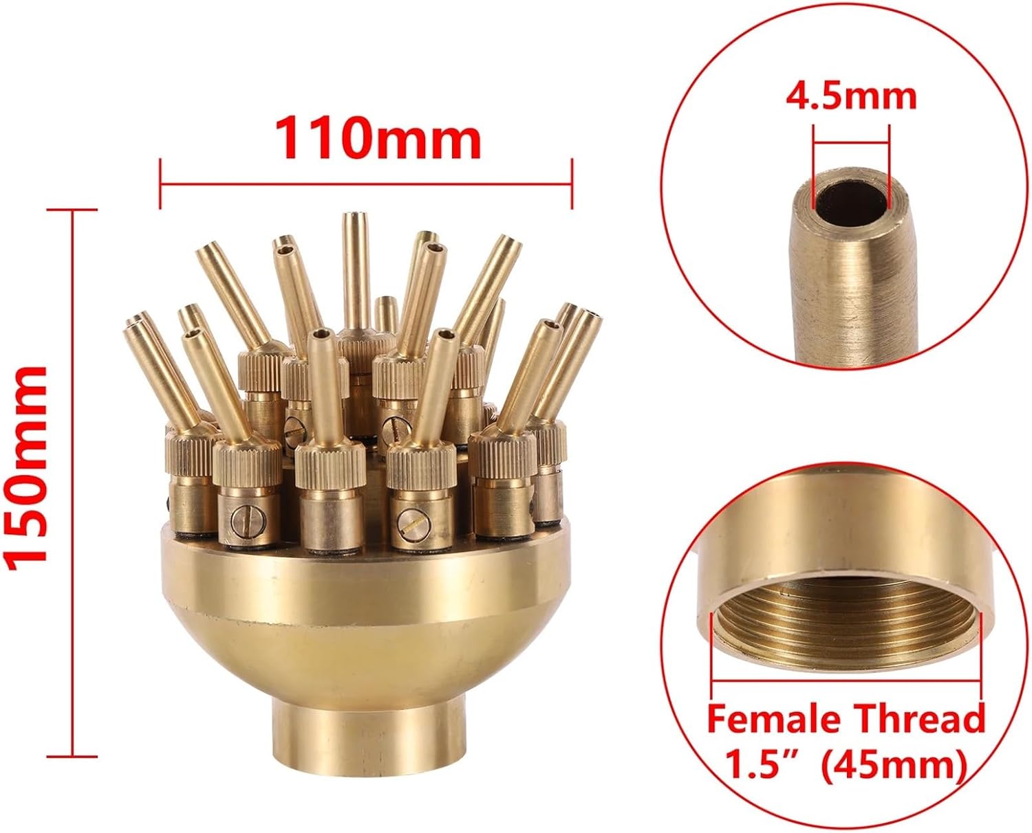 Product information:Product name Brass adjustable three-layer flower fountain nozzleProduct Size 1"/1.5" Female ThreadInstallation method Internal thread connectionPressure 25~85 KpaWater volume 7~12 cubic meters per hourShooting height 1~6mCover diameter 2~2.8mSpecification:1. 1" DN25 Internal Thread Adjustable Three Layer Flower Fountain Nozzle2. 1.5" DN40 Internal Thread Adjustable Three Layer Flower Fountain Nozzlefeature:The fountain nozzle is composed of 19 adjustable straight nozzles with valves, which are dispersed in three different levels.The water mist forms a central water column and two layers of parabolic shapes radiating outward.Due to the adjustable angle of each nozzle, the shape of water level adjustment is flexible.About this productMain function: Universal scattering nozzle, porous, fine workmanship, often used as a fountain nozzle.Suitable for: The sprinkler has a beautiful appearance and a beautiful water feature, making it ideal for garden applications.Easy installation: The installation method is simple, and it adopts internal thread connection, which can adapt to various pools and fountains.