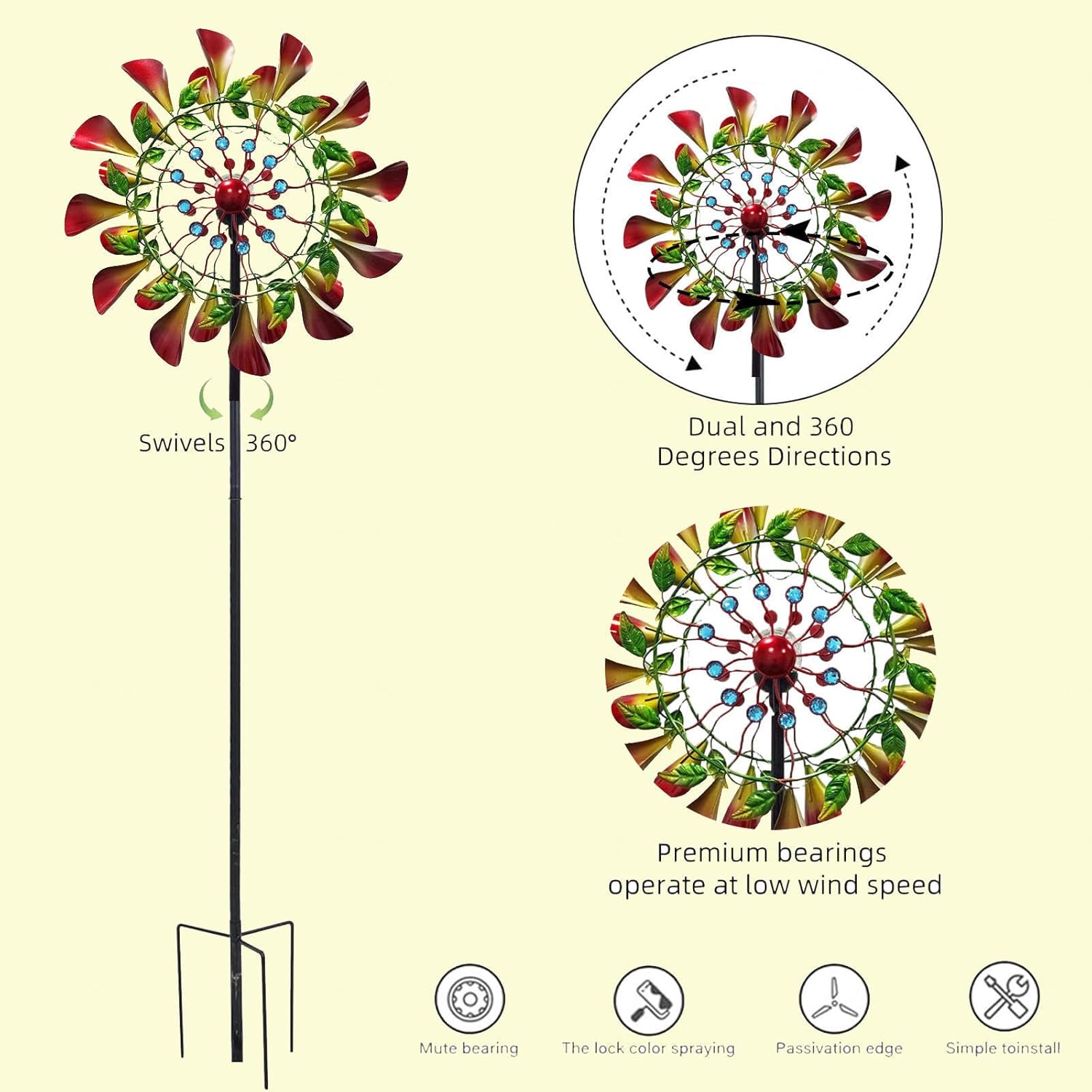 Our solar powered wind weather spinners are a wonderful addition for your patio, lawn or garden. An attractive all weather wind spinner with a double-sided windmill that provides a mesmerizing display of movement and light. Watch as the blade panels spin in opposite directions, offering a stunning display of changing colors for up to 8 hours a night.Feature1. Oversized2. Easy to install3.360° bi-directional dual rotors4. Red5. Solar lighting6. Automatic switch7.6 colors of led lightsProduct size: 83inches*22inchesProduct weight: 8lbPacking list: 1* solar windmill light, 1* step-by-step assembly instruction【Worry-free purchase】 we are here to make sure you will receive the best customer service. If you have any concern over our garden wind spinners, please feel free to contact us.