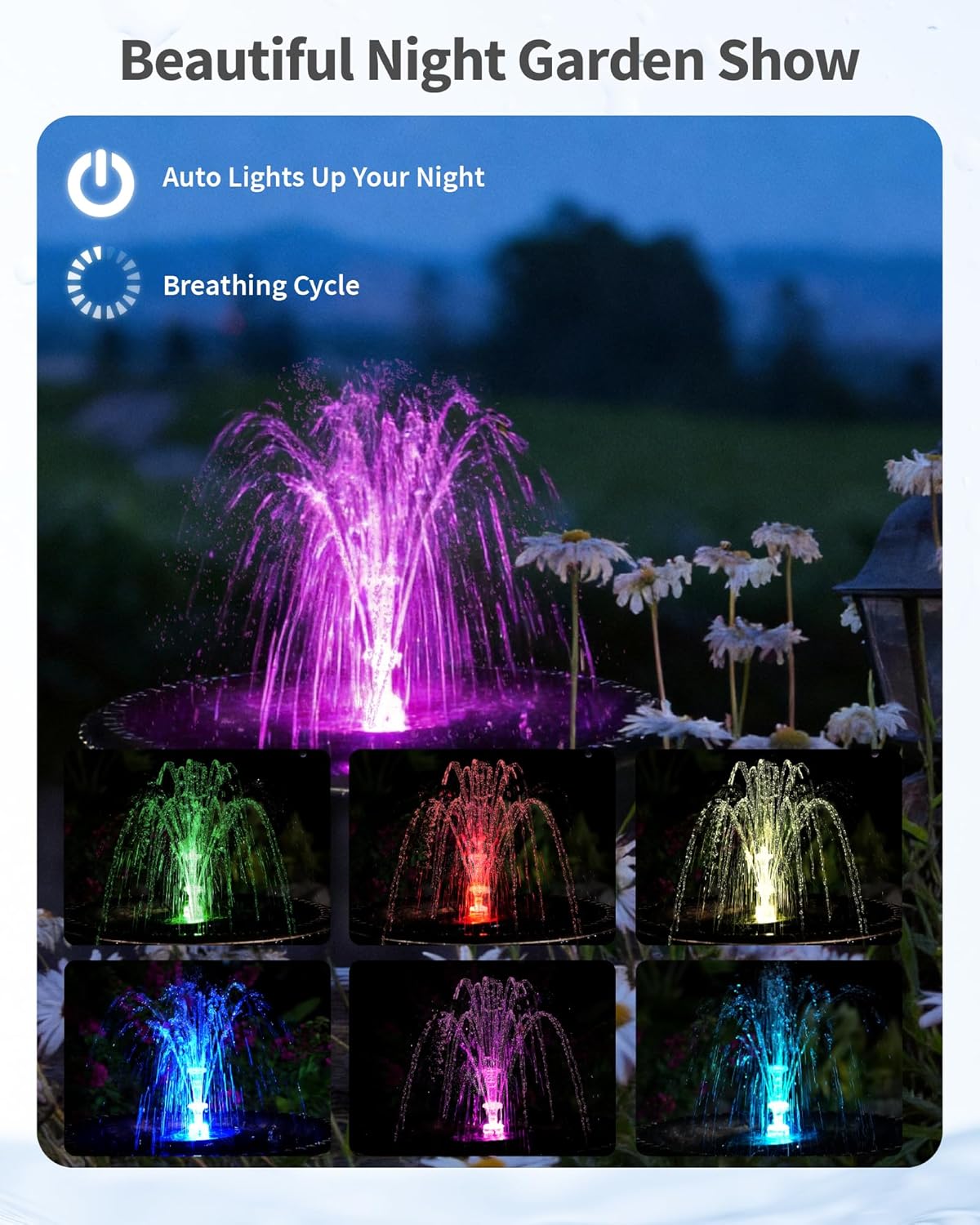 | Included Components | Led lights, Nozzles & 3.94FT Tubing, Solar panel, User Manual, Water pump |