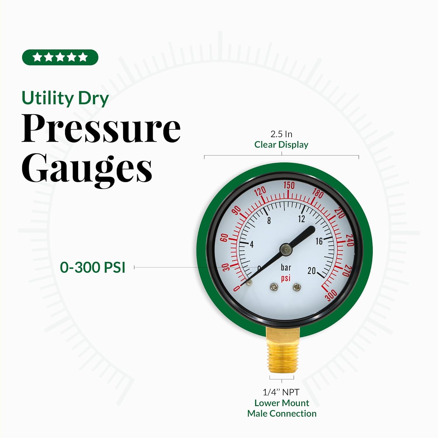 This High Quality Durable SUPPLY GIANT Water Pressure Gauge is designed for Water Pressure measuring on the filter for swimming pool, Sprinkler System, Spa, Aquarium Well Pump, Aquarium, Water Hose or any Water pressure. This WATER PRESSURE GAUGE is specializing in High quality Material, Easy durable 1/4" NPT lower mount male Connection, Easy Crystal Clear Display with 2.5" dial - Double Scale - Super-Accurate reading. Dial size: 2.5" Process connection: 1/4" NPT lower mount male Case: Black steel case and bezel Window: Solid Polycarbonate Crystal Dial Plate: aluminum, with pointer stop Pointer: Aluminum, black, DIN style Bourdon tube: Copper Alloy Movement: Brass Connection: Brass IP class: IP43 Accuracy: +/-3-2-3%Pressure range: 0-300 psi Working temperature:-40 to 150 deg F/-20 to 65 deg C Our High Quality Accurate water pressure Gauge will reduce your water bills and plumbers cost, and help you create an efficient water-saving irrigation system
