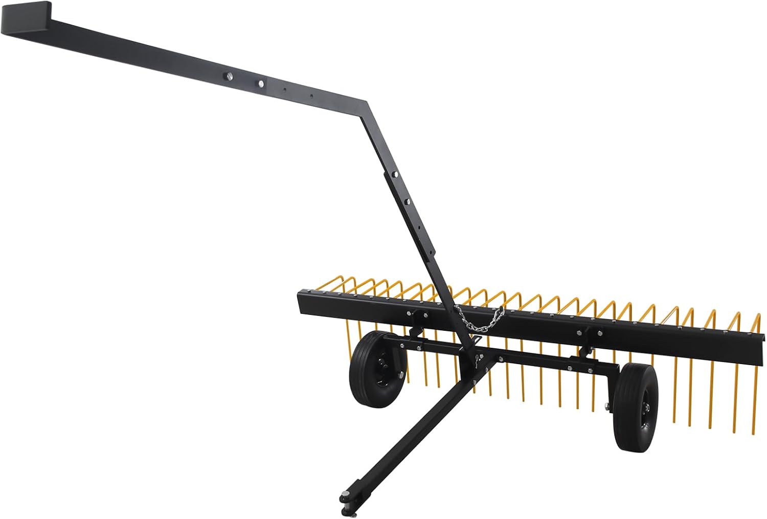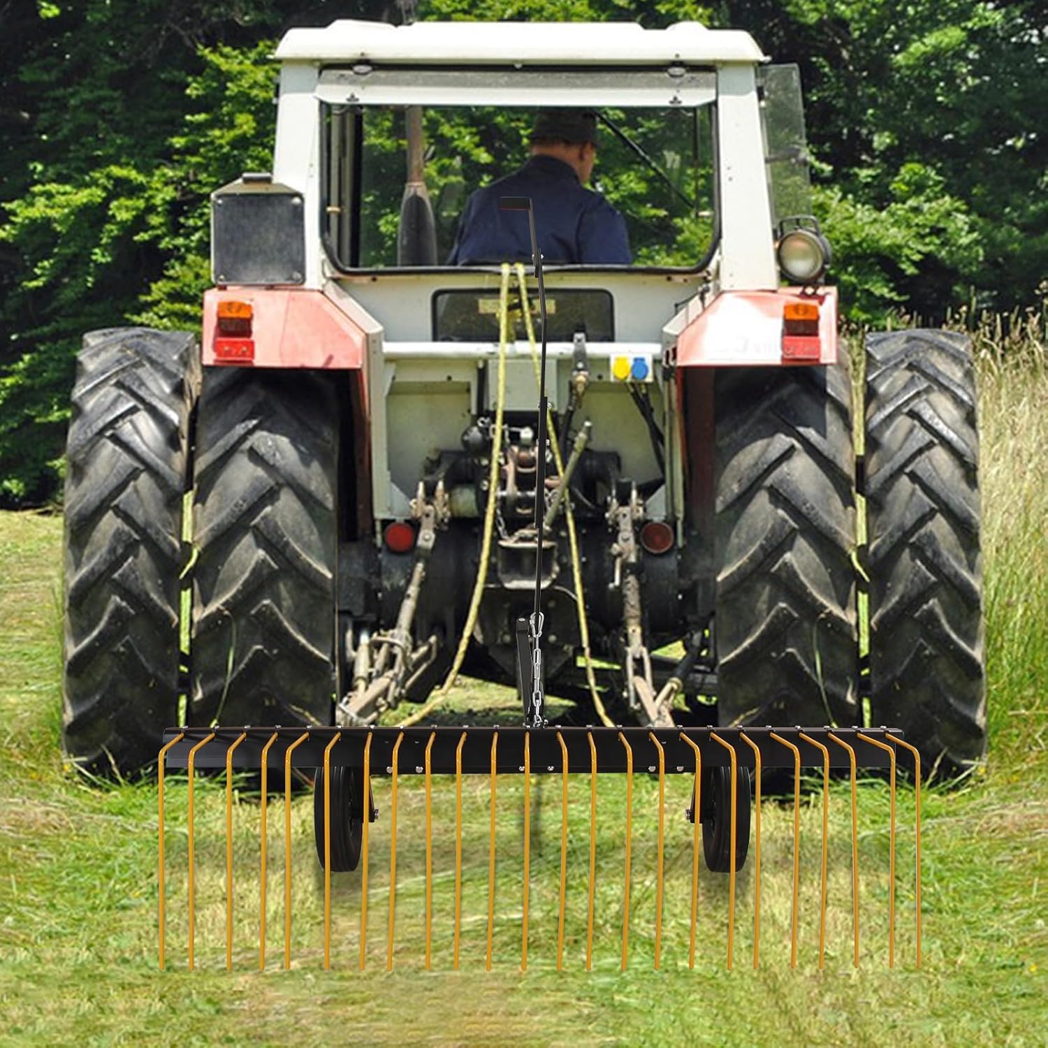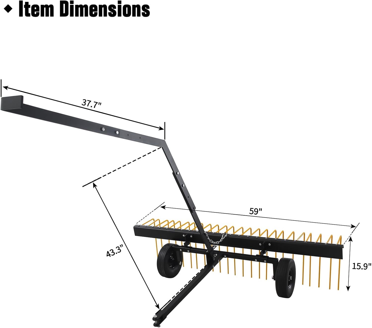 ▶ABOUT THIS ITEM: Overall Dimensions: 59 x 59 x 15.9 Inches Weight: 69.75 Pounds Rake Type: Lawn Rake ▶FEATURES: ⏩This landscape rake has 13-inch pneumatic tires, which reduce friction with the ground during operation for smoother movement. ⏩The pine straw rake is equipped with a 3-section adjustable handle, allowing flexible adjustment based on ground slope and debris type. ⏩The pine needle rake features 24 spring steel tines with excellent toughness. They are not easy to bend or break and can accurately rake up yard debris. ⏩Our garden pine straw yard rake can be easily installed without professional guidance. ⏩We always strive to provide high-quality products and services to our customers; if you have any questions or concerns, please feel free to contact us. ▶PACKAGE: 1 x Lawn Rake 1 x Installation Instructions 1 Set of Accessories ♥Note: For safe and efficient use, please read the installation instructions carefully before assembling the lawn rake, and ensure it is firmly attached to your ATV/lawn tractor before starting operation.