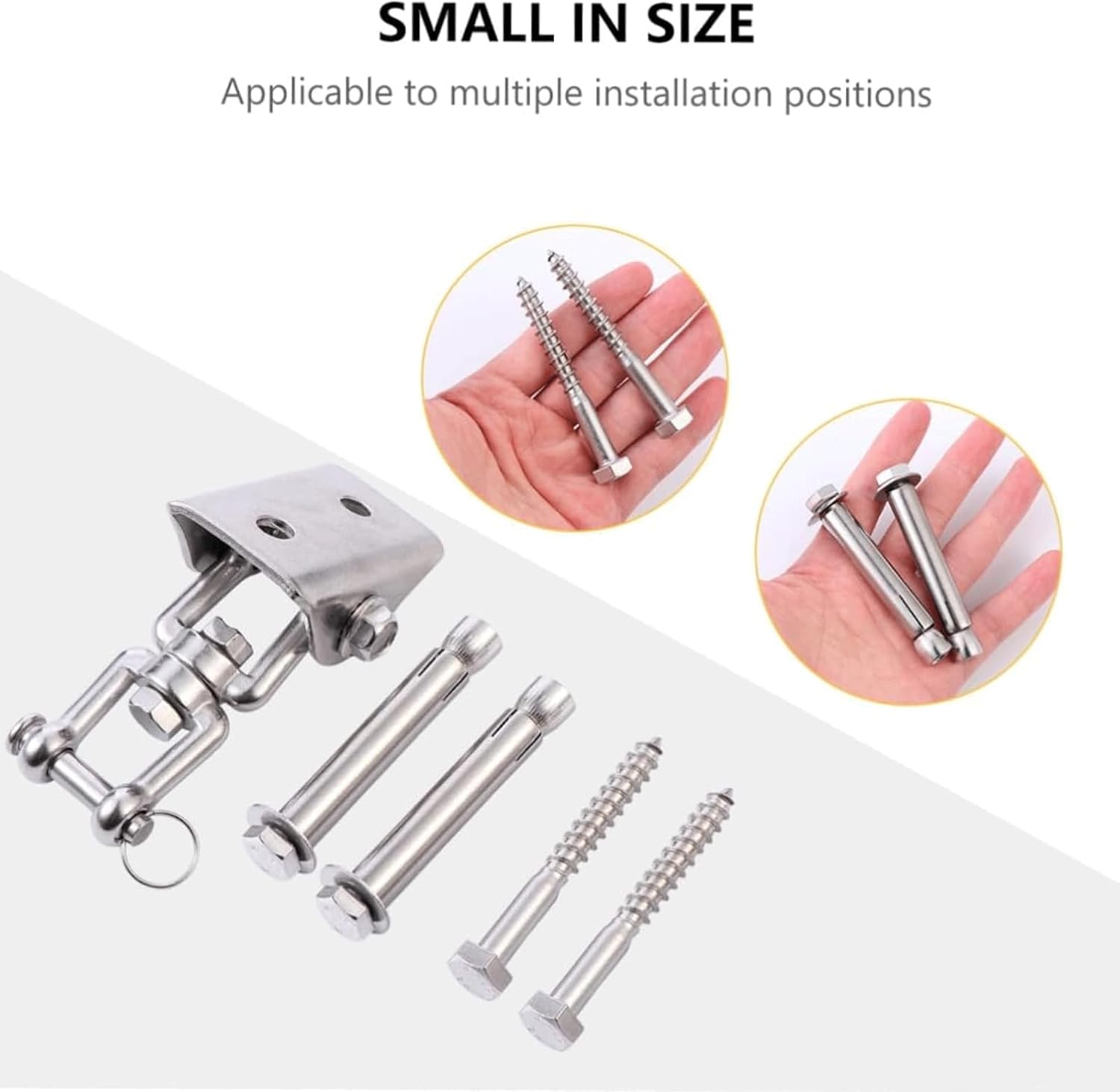 Name: Hanging Accessory/Swing Sets Hardware/Swivel Swing Hook/Screw Bracket/Swing HangersMaterial: stainless steelColour: silverSize: 70*40*100cm/2.75*1.6*3.94inPackage Include:1Set Heavy Duty Swing HooksWarm Notices :1.Since the size is manually measured, please allow an error of 1-2mm, and don't mind when you buy it.2.The color of the product may vary slightly due to photography & your screen.