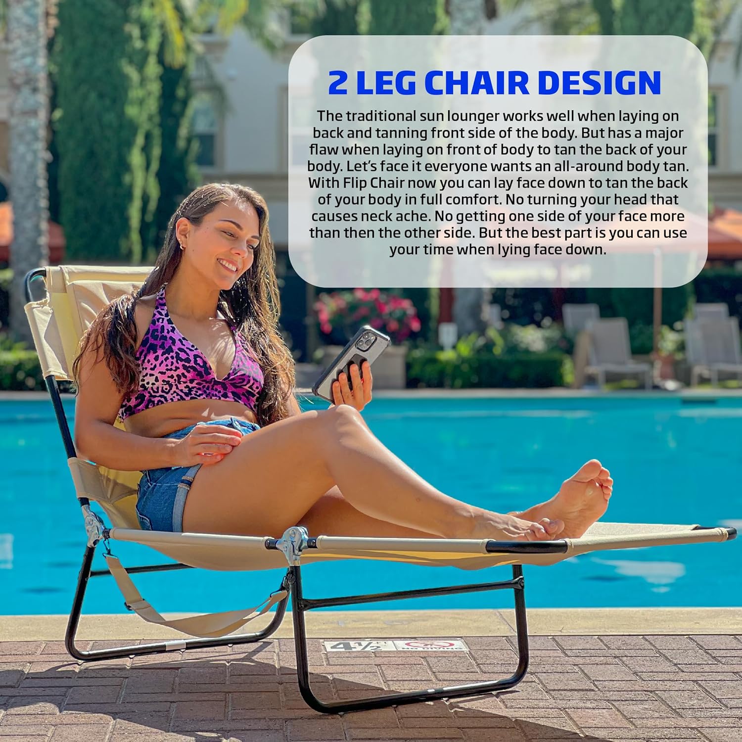 The Chair is the ultimate in relaxation and comfort. Lay back and relax like normal lounge chair then when ready flip over and you can lay face down and insert face and arms through the chair and you can enjoy your tanning by using your phone, reading a book or watching a movie. The traditional sun lounger works well when laying on back and tanning front side of the body. But has a major flaw when laying on front of body to tan the back of your body. Let’s face it everyone wants an all-around body tan. With Flip Chair now you can lay face down to tan the back of your body in full comfort. No turning your head that causes neck ache. No getting one side of your face more than then the other side. But the best part is you can use your time when lying face down. Unlike other lounge chairs. Our backrest system does not collapse into itself when sitting in middle of chair. No other chair is stronger and more comfortable than the Flip Chair. Made from only the best metal, fittings and fabric. Polyester fabric is great UV resistant Chair can be used as beach chair, lounge chair and flat position. This chair meets the demands of today’s busy lives. Now you can sun tan and also read a book or use your phone. While being face down in a comfortable position your arms and face go through the chair to put you into a comfortable position. We know you will love this face down chair. Try it we know you will love it.