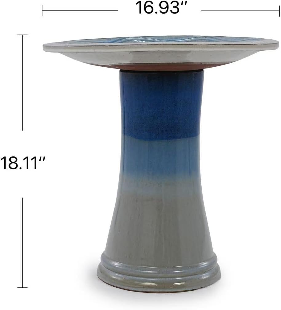Features: Premium ceramic construction with a smooth, weather-resistant blue ombre glazed finish Spacious 16.93-inch diameter basin provides ample space for multiple birds Sturdy pedestal base ensures stable placement in gardens, patios and yards Handcrafted artisanal design with unique subtle variations in glaze and texture Dual-functional design serves as a bird bath and decorative outdoor focal point Specification: Product Type: 17'' Ceramic Bird Bath for Outside Material: High-quality ceramic Dimensions: 16.93'' (Diameter) × 18.12'' (Height) Weight: 26.00 lbs Color Options: Sapphire Blue Ombre, Sky Blue Ombre Finish: Hand-applied glossy glaze Assembly: Pre-assembled, ready to use